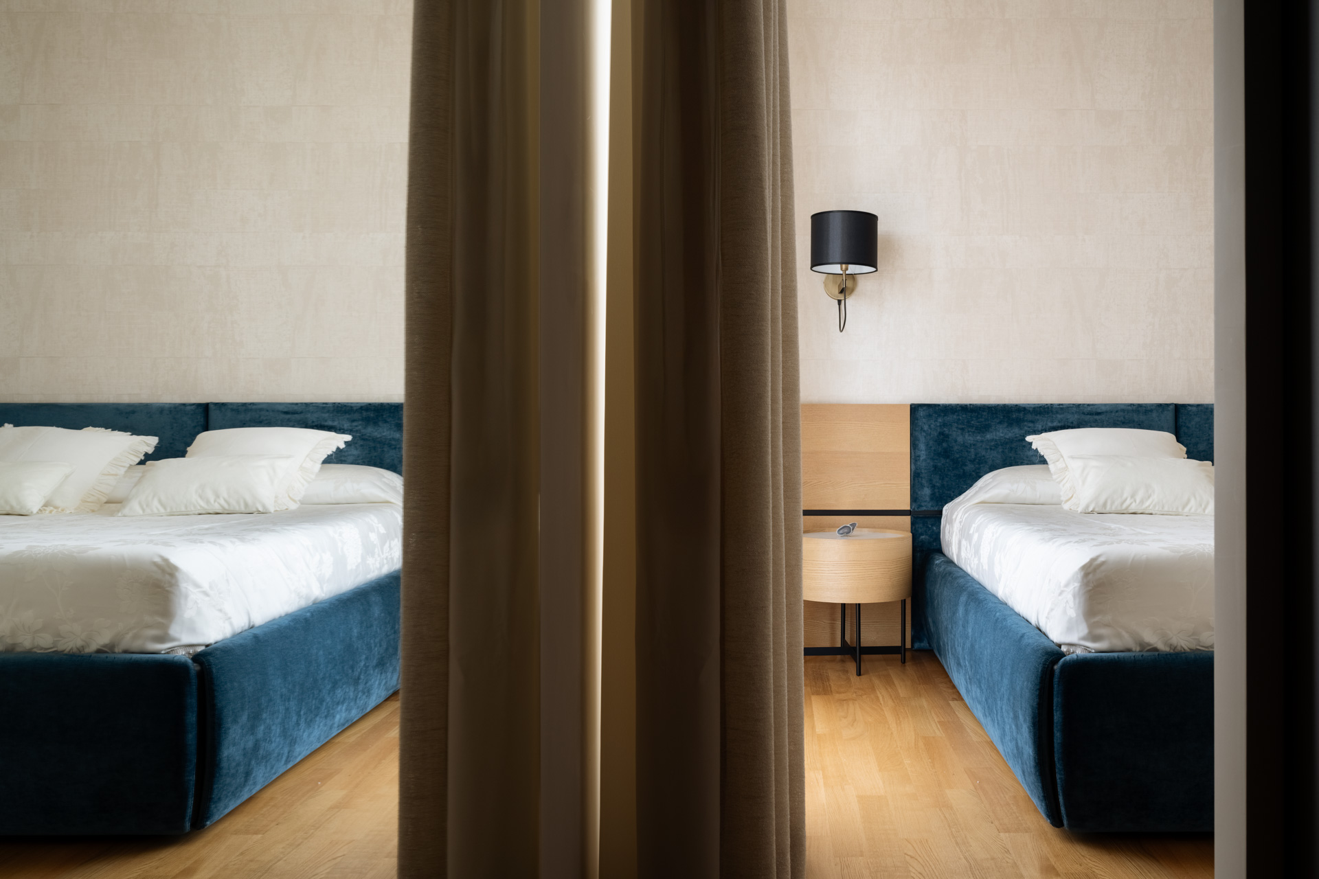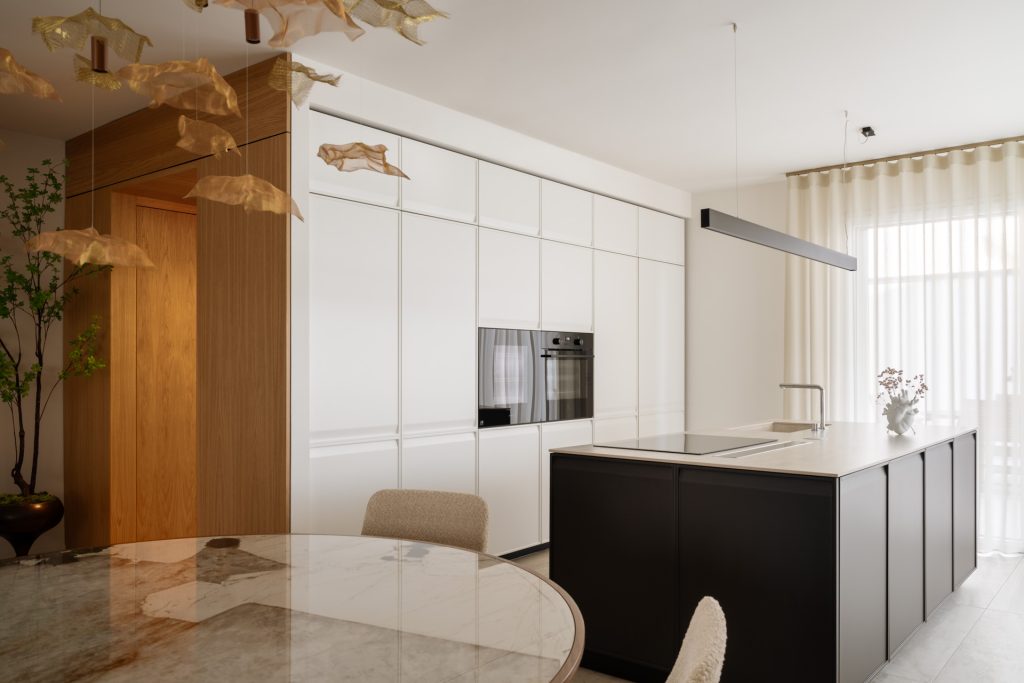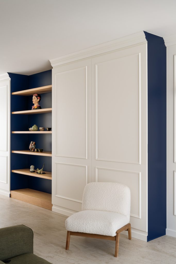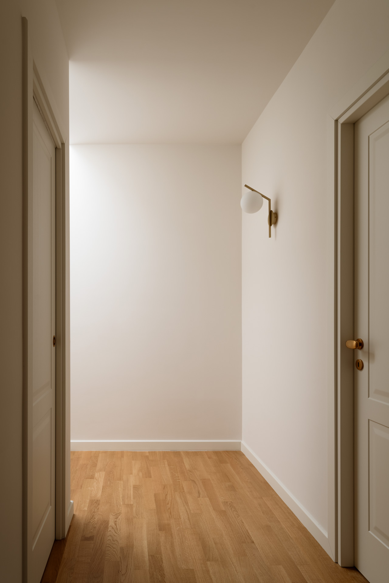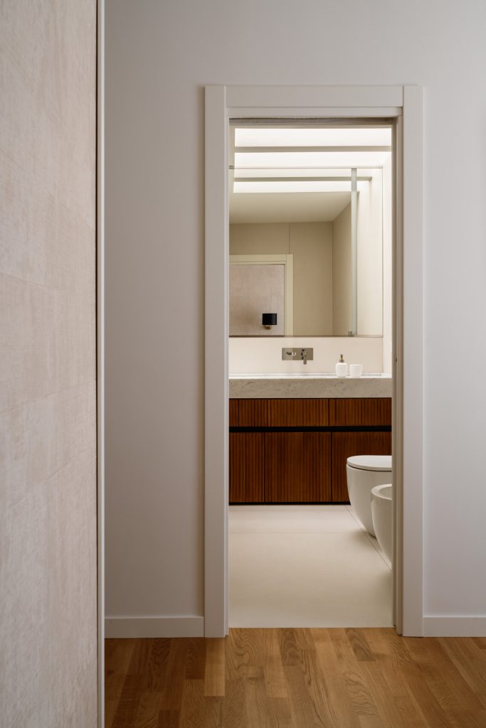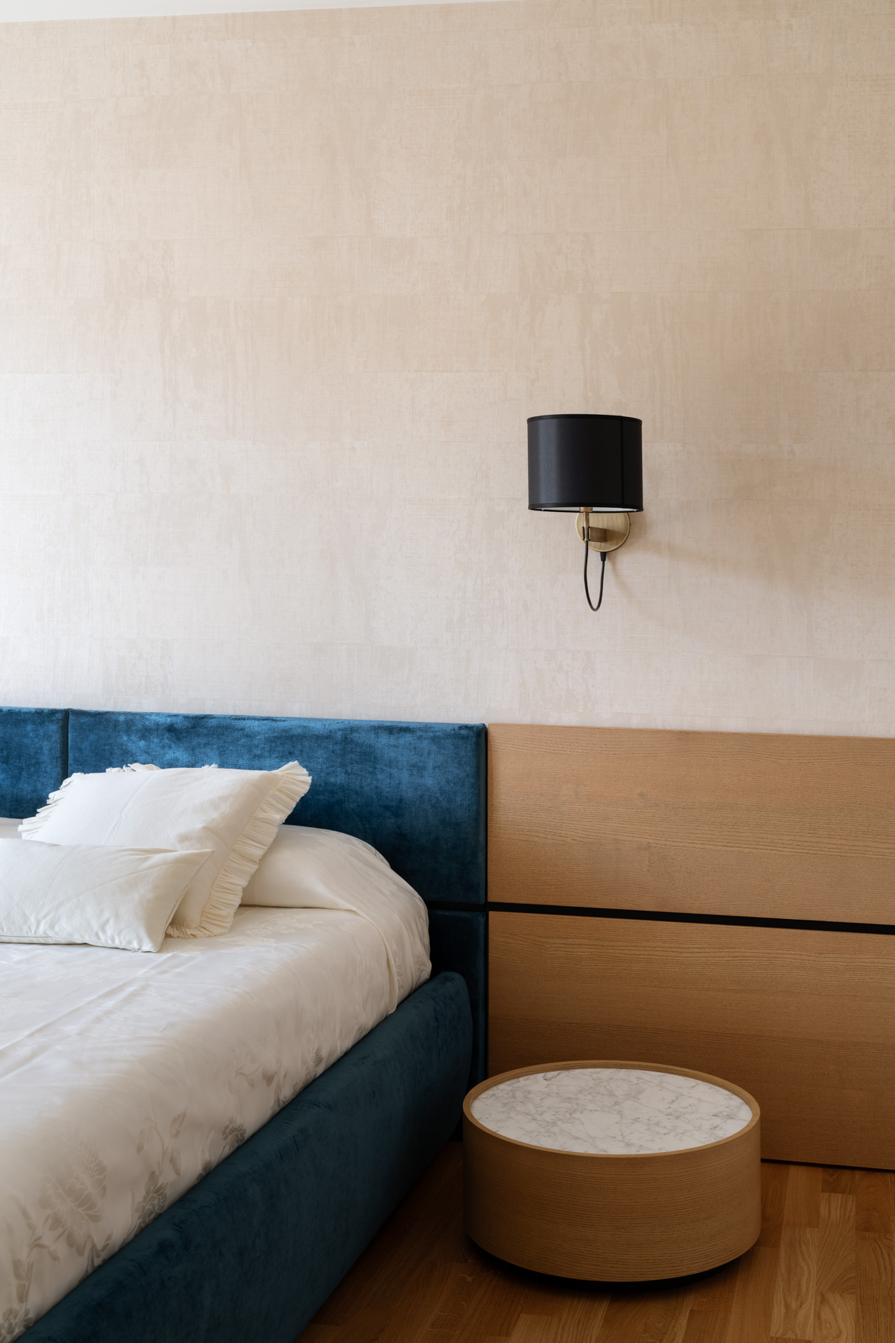 Un segno ligneo, sospeso e leggero, attraversa verticalmente l’ambiente. La sua essenza in rovere naturale introduce un contrasto caldo rispetto al bianco dominante, definendo un equilibrio tra rigore e intimità. Questo elemento diventa connessione, accompagnando alla zona notte, dove l’atmosfera si fa più raccolta e materica. Qui, i toni della terra e del blu del cielo evocano la dimensione dell’intimità e del riposo.
