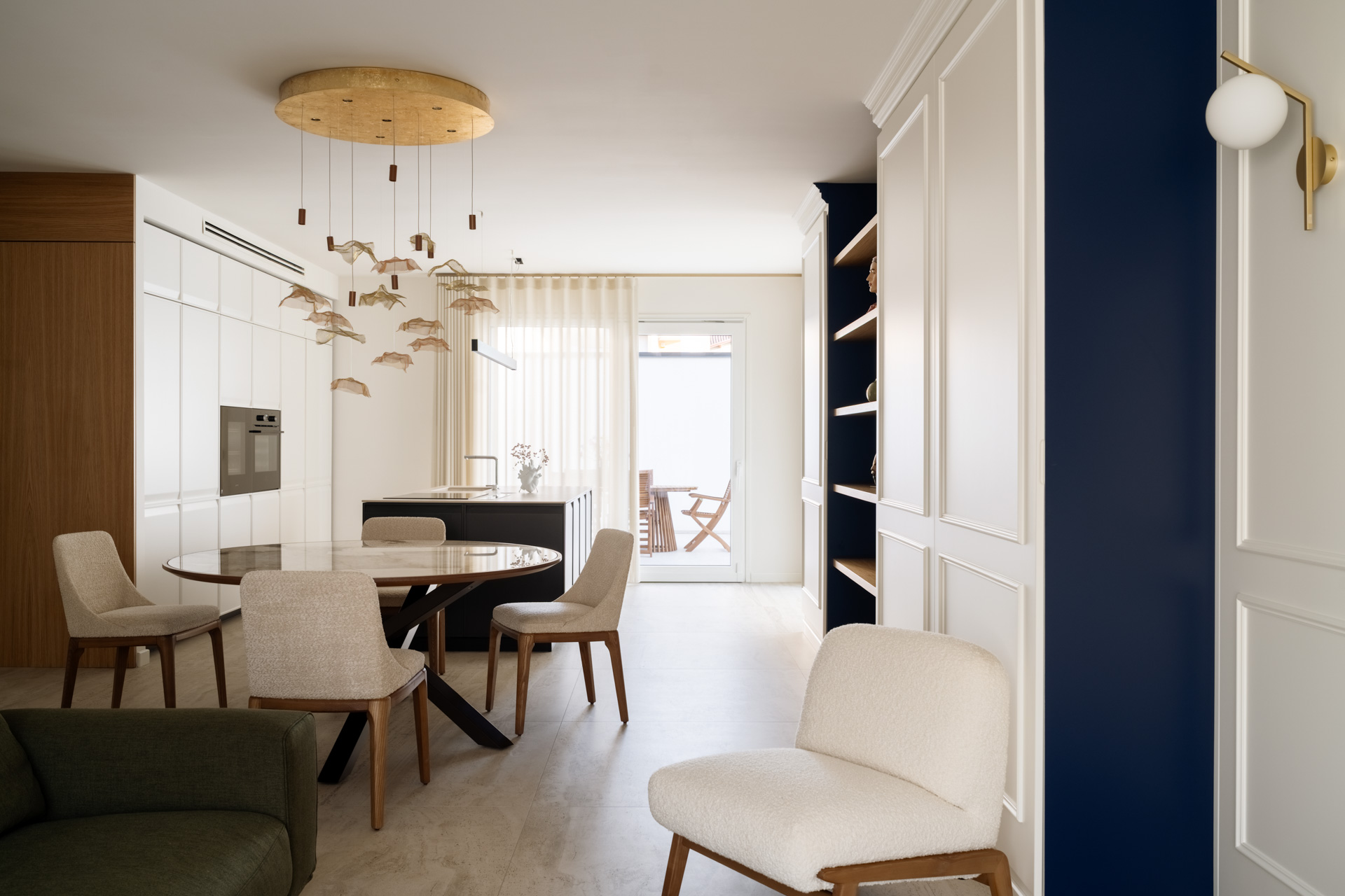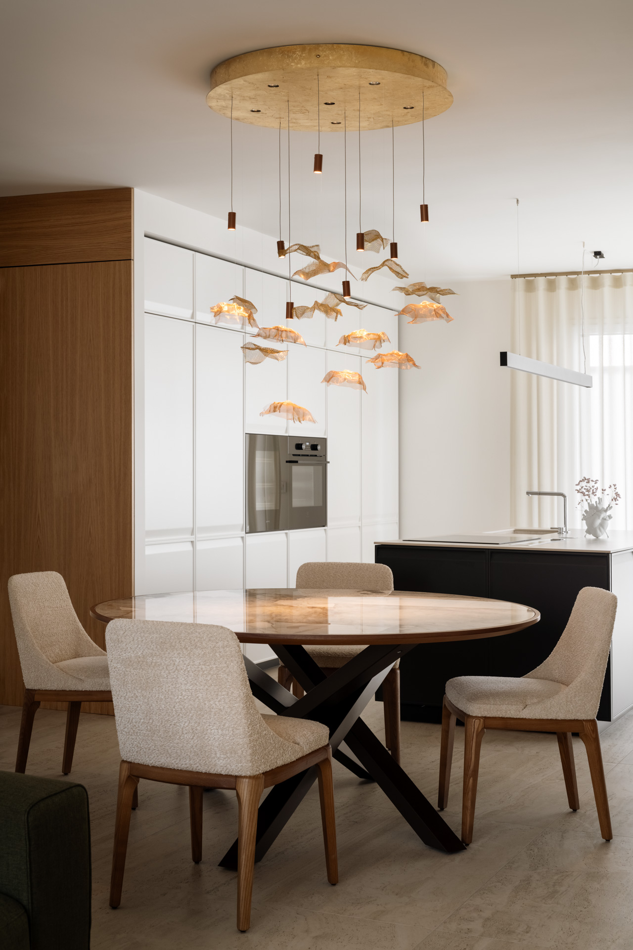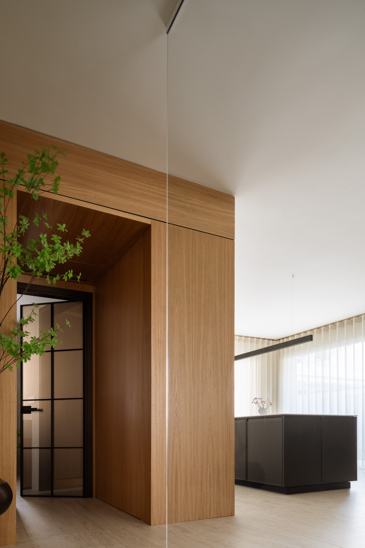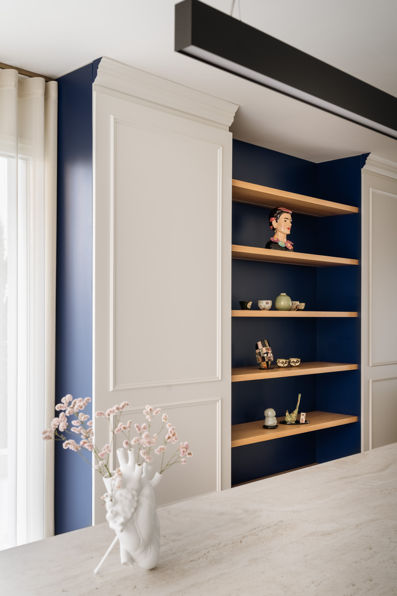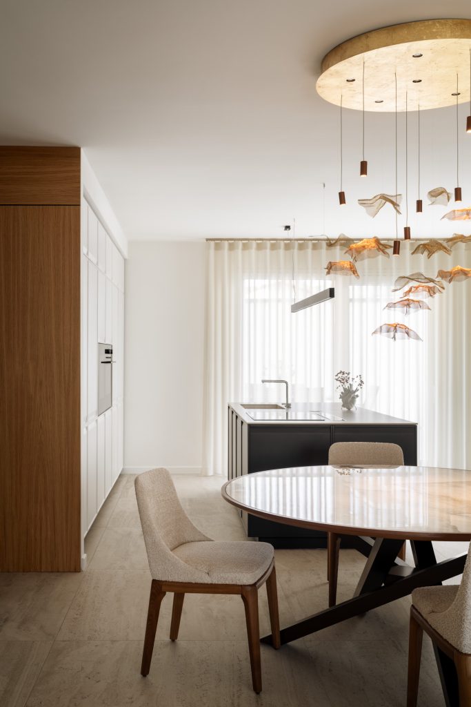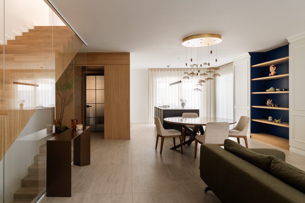 Un segno ligneo, sospeso e leggero, attraversa verticalmente l’ambiente. La sua essenza in rovere naturale introduce un contrasto caldo rispetto al bianco dominante, definendo un equilibrio tra rigore e intimità. Questo elemento diventa connessione, accompagnando alla zona notte, dove l’atmosfera si fa più raccolta e materica. Qui, i toni della terra e del blu del cielo evocano la dimensione dell’intimità e del riposo.