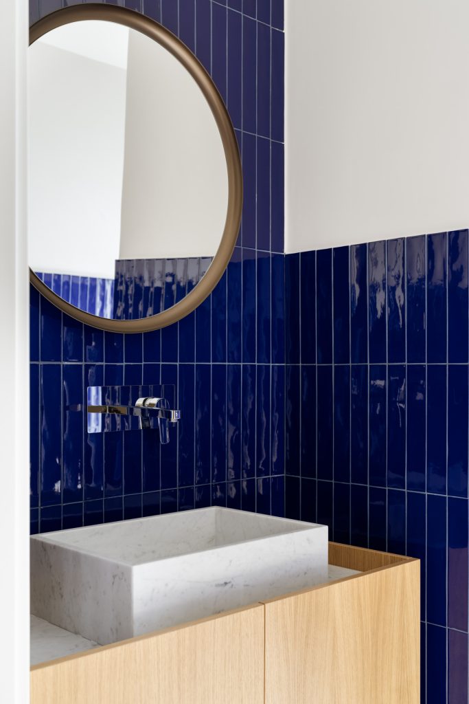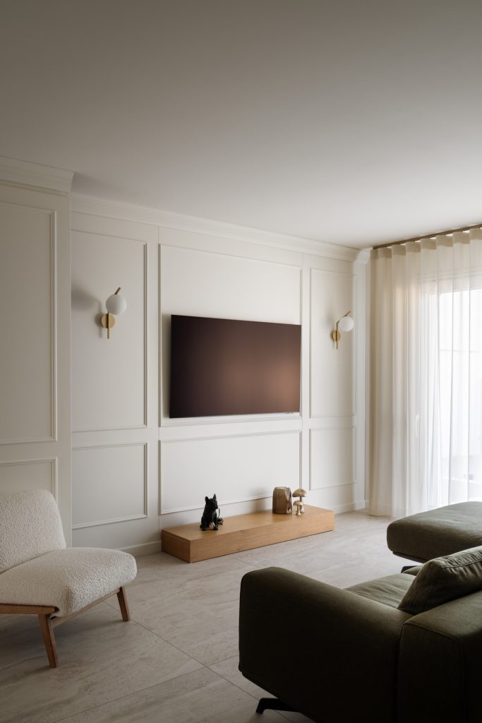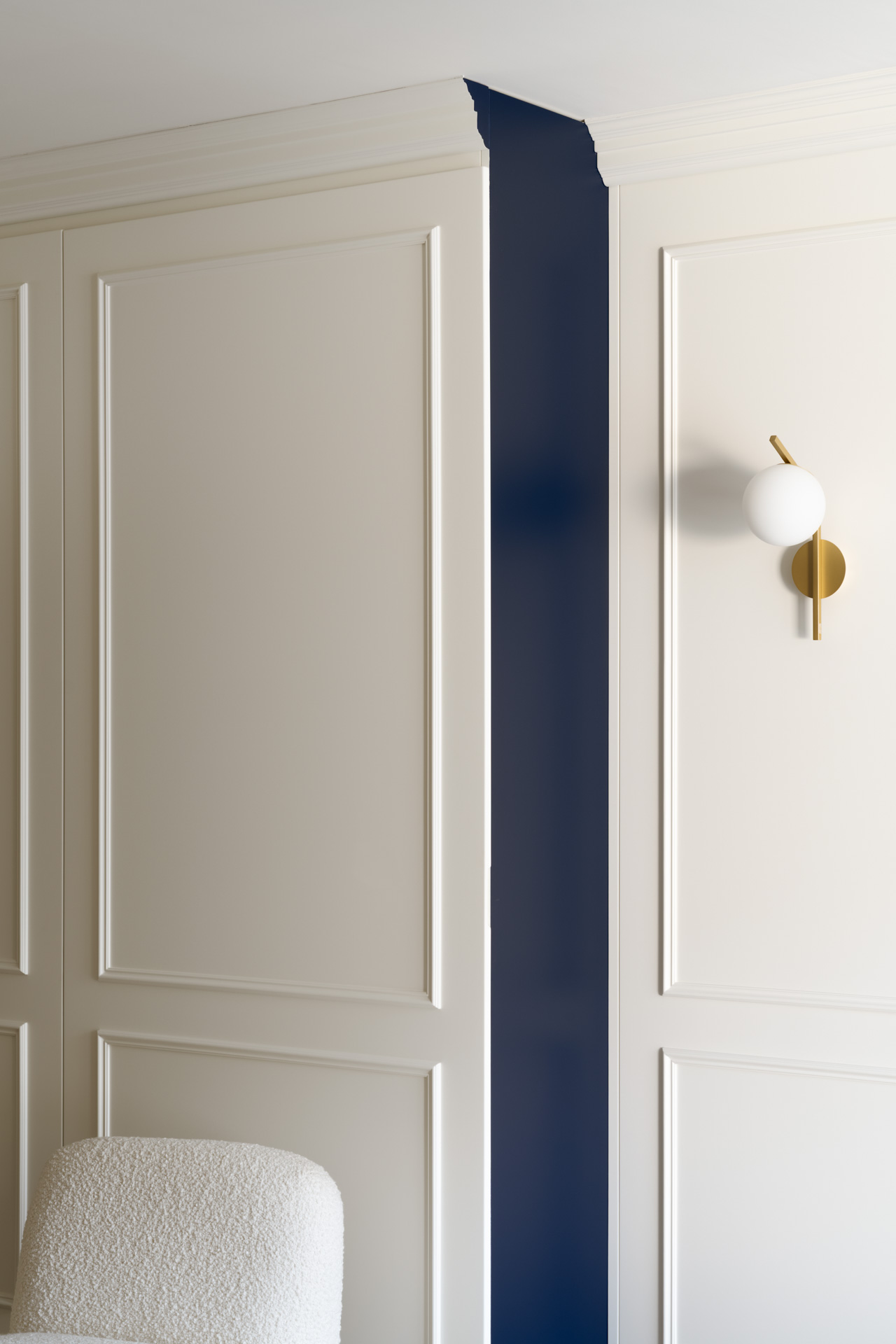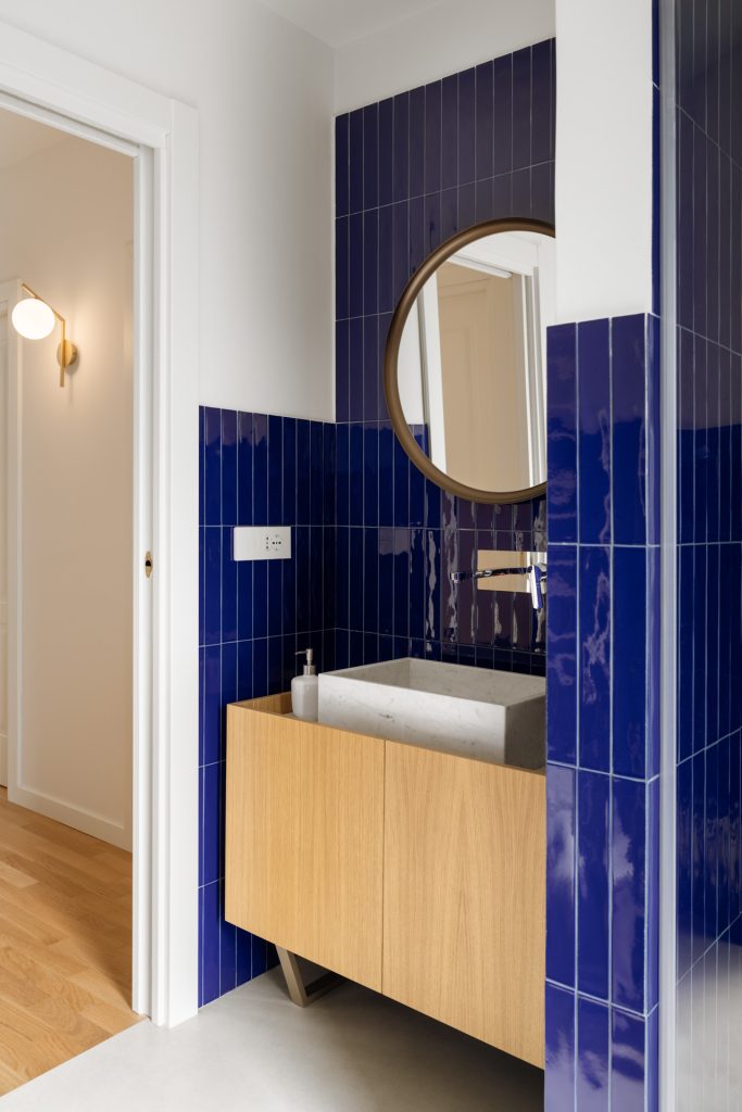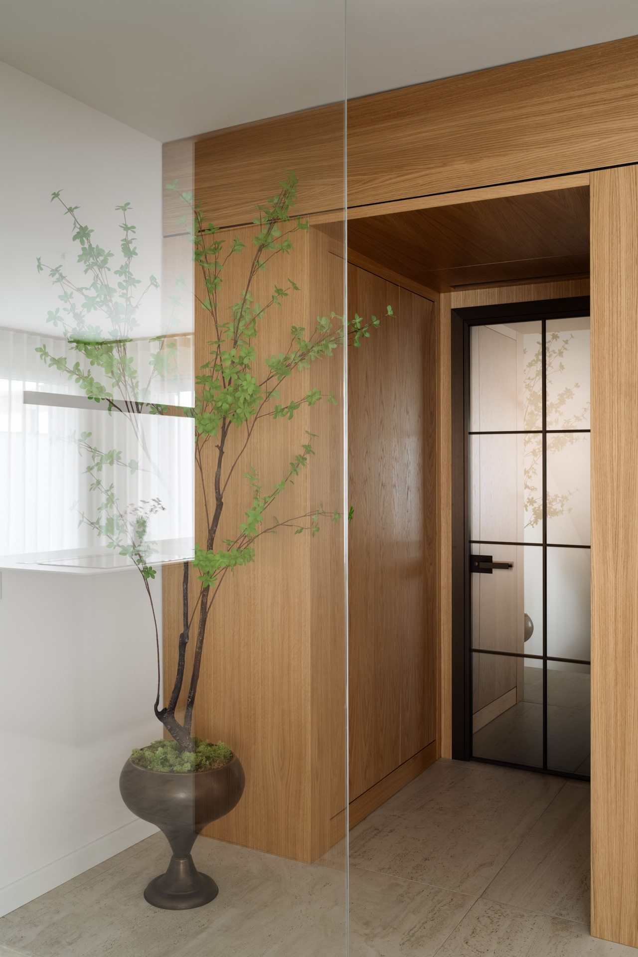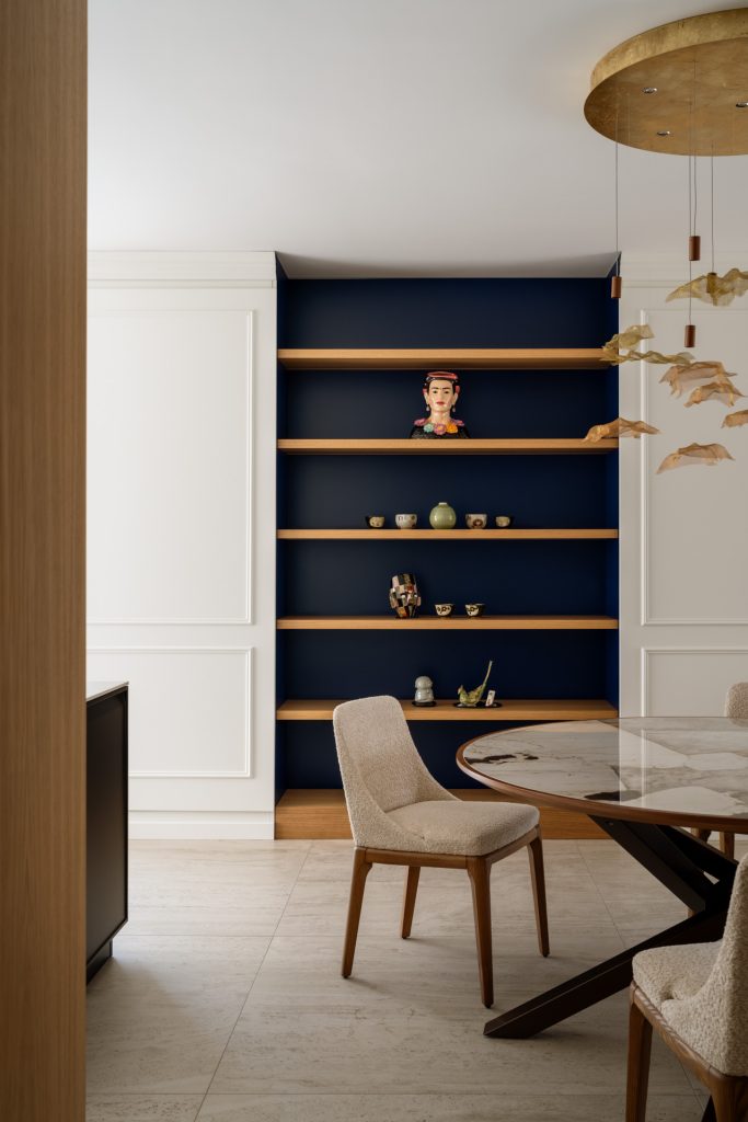Un segno ligneo, sospeso e leggero, attraversa verticalmente l’ambiente. La sua essenza in rovere naturale introduce un contrasto caldo rispetto al bianco dominante, definendo un equilibrio tra rigore e intimità. Questo elemento diventa connessione, accompagnando alla zona notte, dove l’atmosfera si fa più raccolta e materica. Qui, i toni della terra e del blu del cielo evocano la dimensione dell’intimità e del riposo.