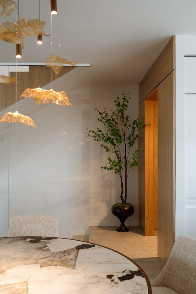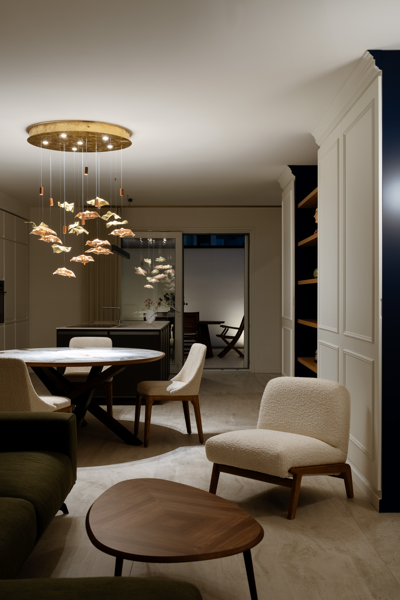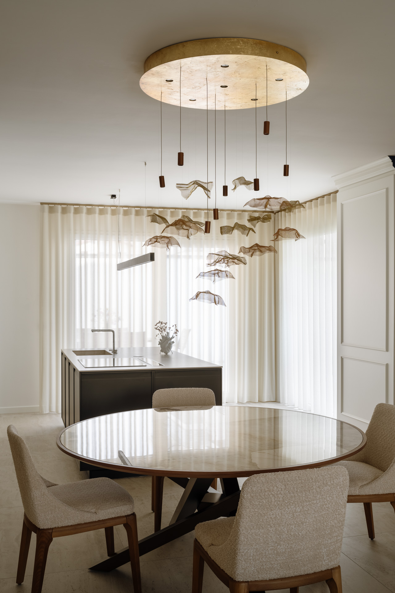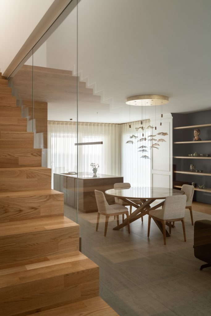 Il piano terra è concepito come spazio della convivialità. I percorsi convergono verso un punto centrale — la tavola circolare — simbolo di condivisione e nucleo della vita domestica. Intorno ad essa lo spazio si apre, fluido e continuo, in un dialogo costante tra pieno e vuoto, tra luce e materia.