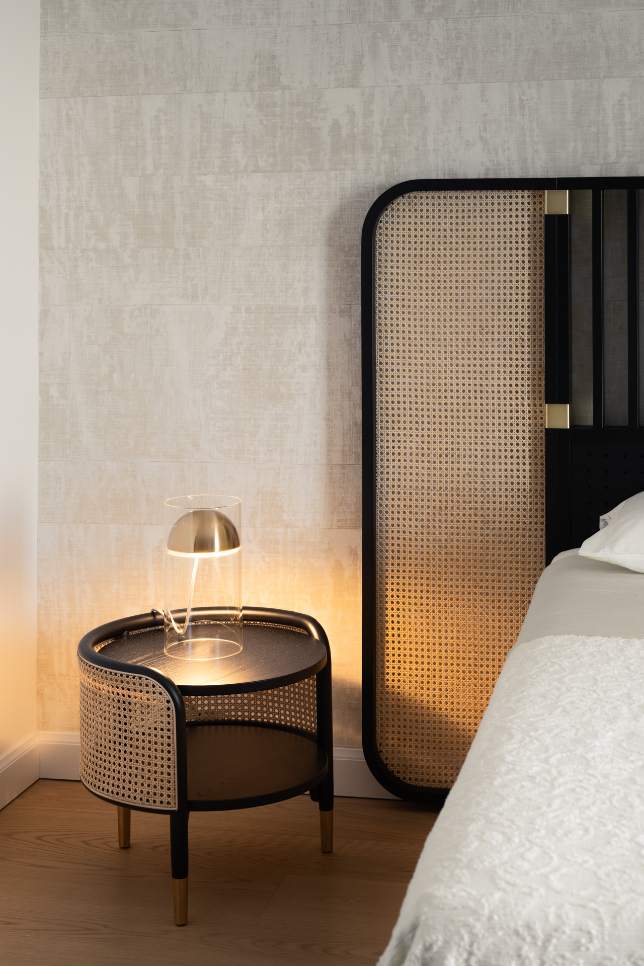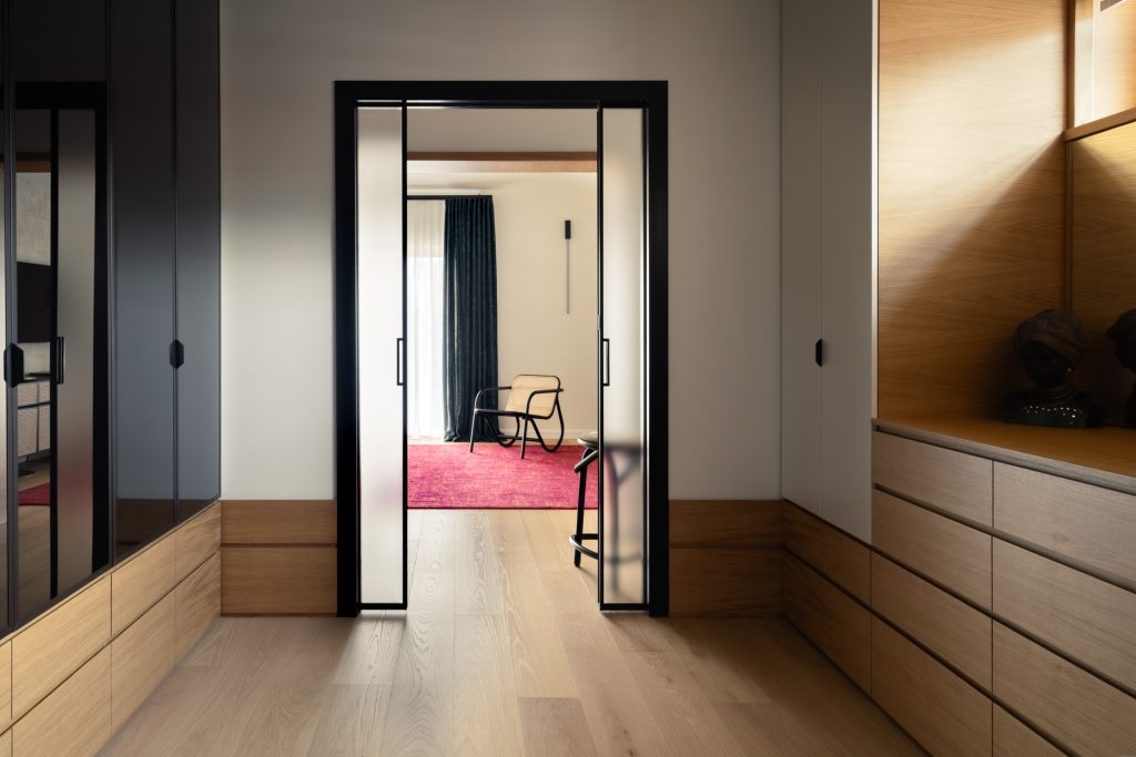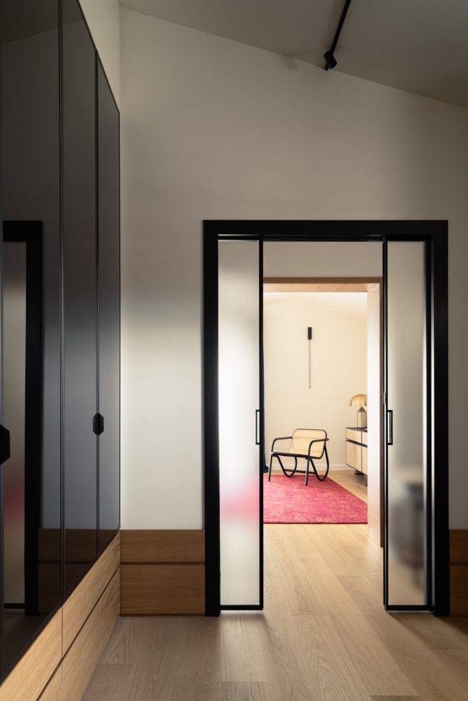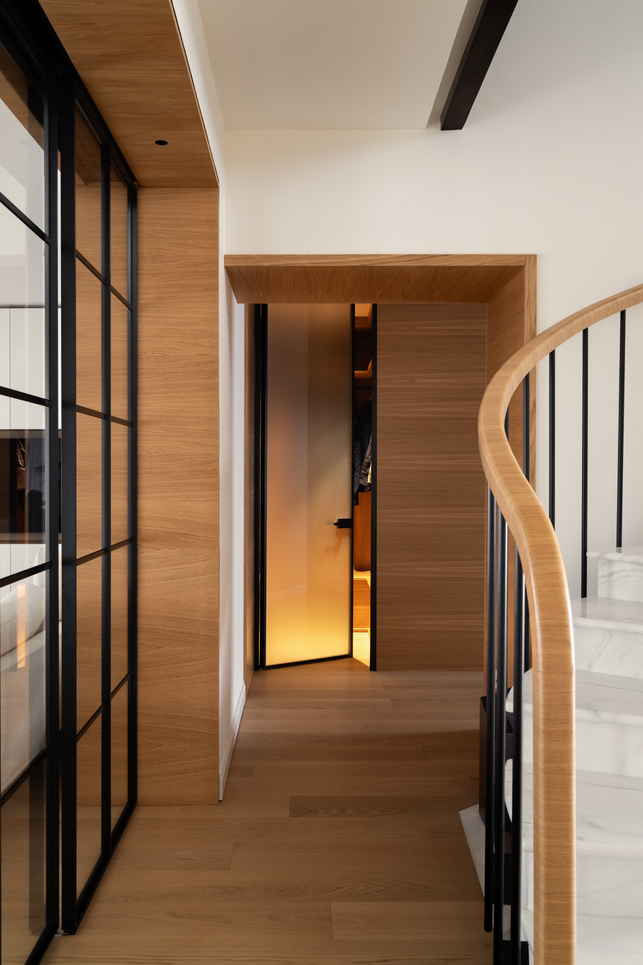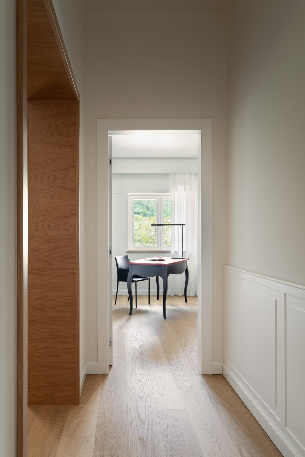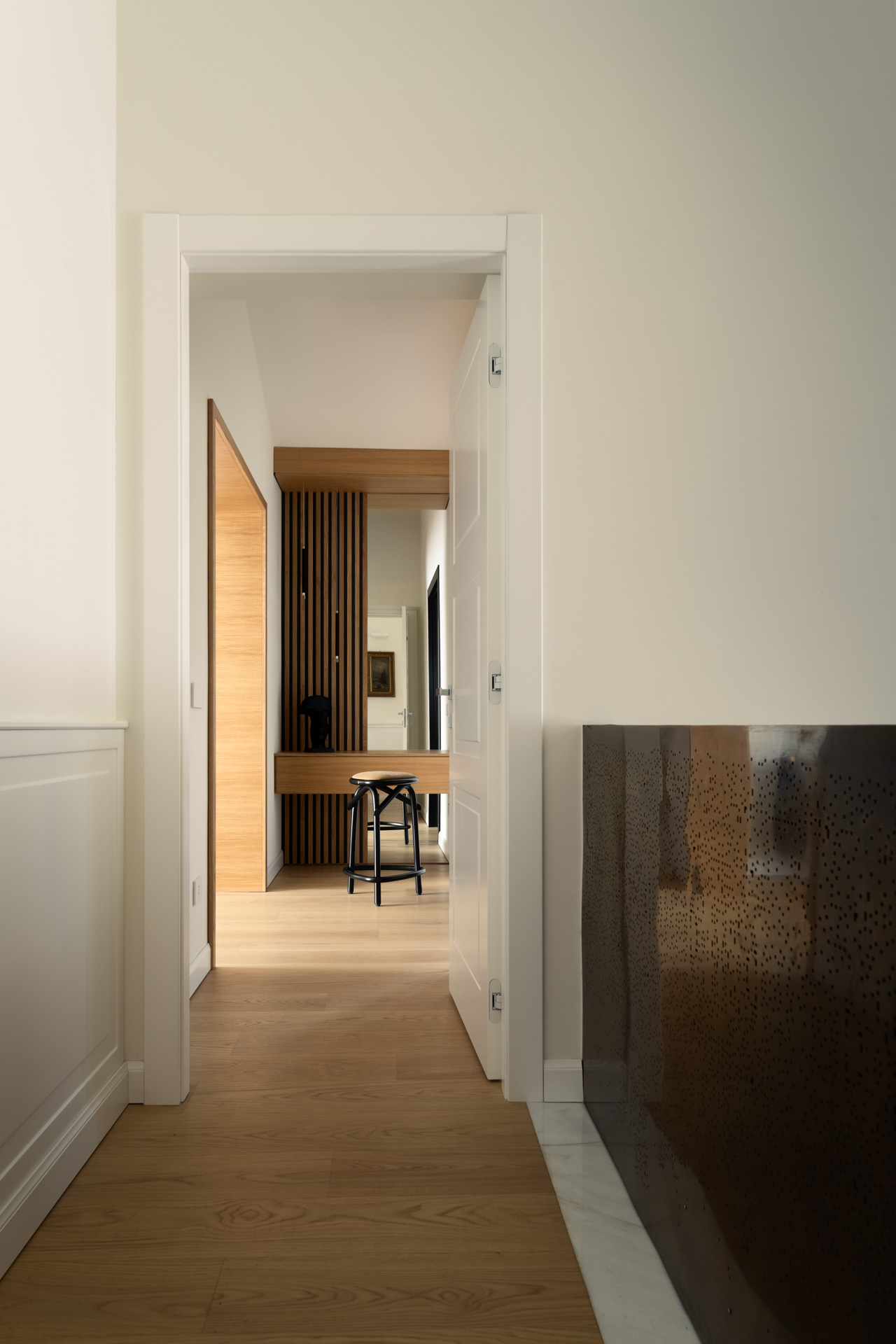 Al livello superiore, la distribuzione si organizza in due ali: da una parte i servizi centrali e due camere, dall’altra la suite padronale, articolata in tre ambienti — camera, cabina armadio e bagno privato — connessi in un continuum di luce e materia.