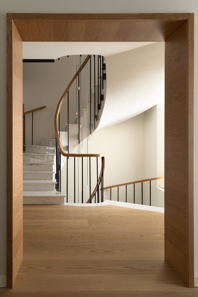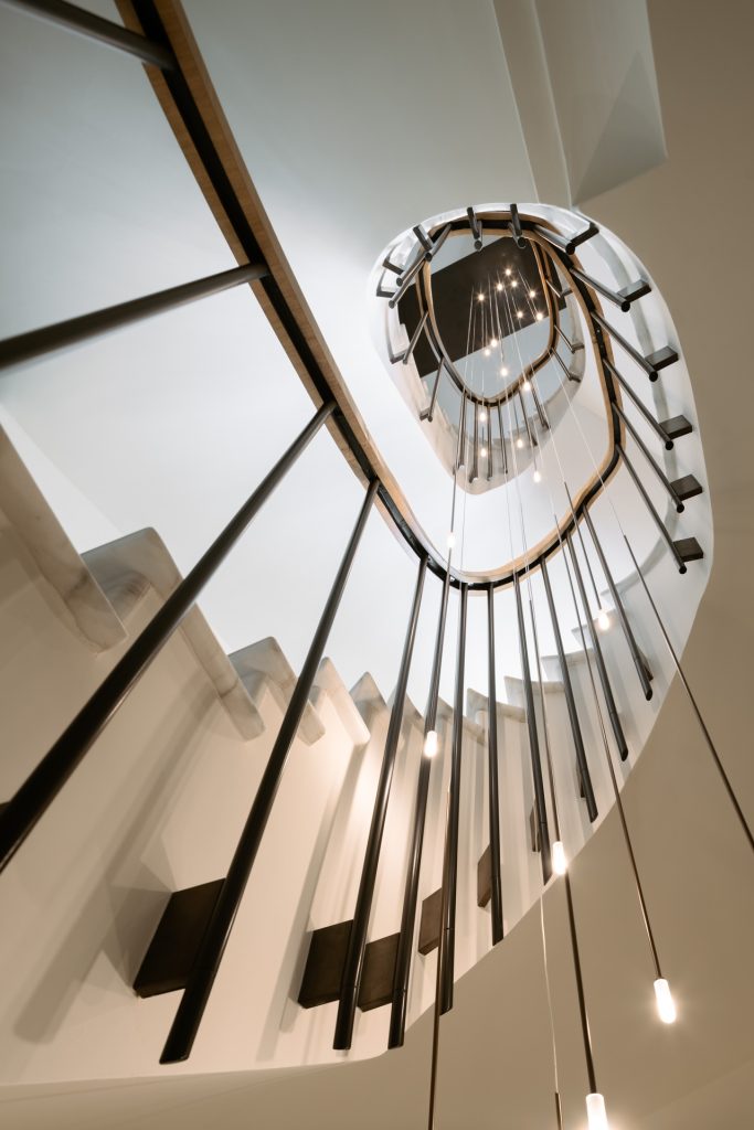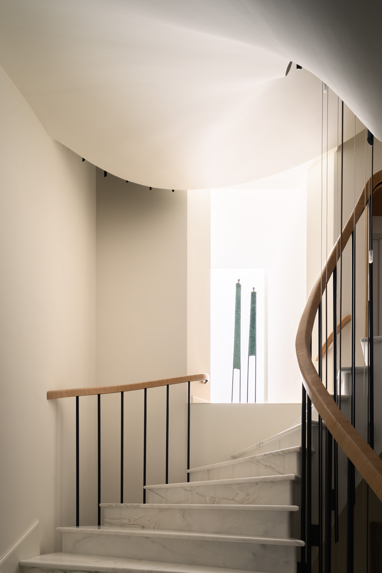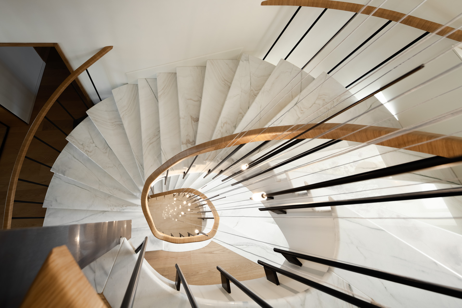A dominare lo spazio è la scala elicoidale in marmo bianco, avvolta da un nastro continuo di legno: una scultura abitabile che accompagna il movimento verticale e genera prospettive sempre diverse.