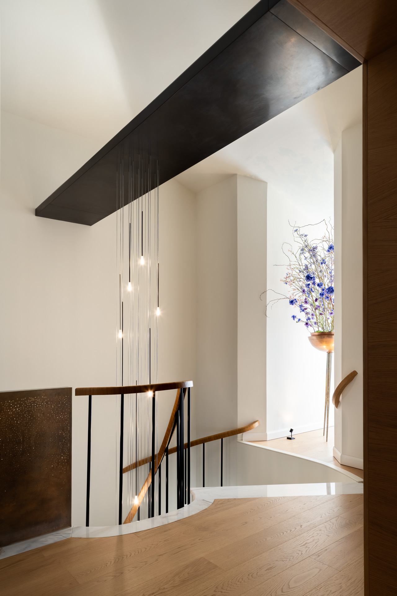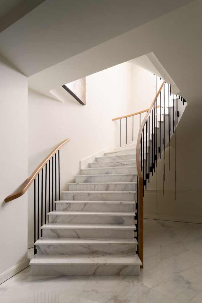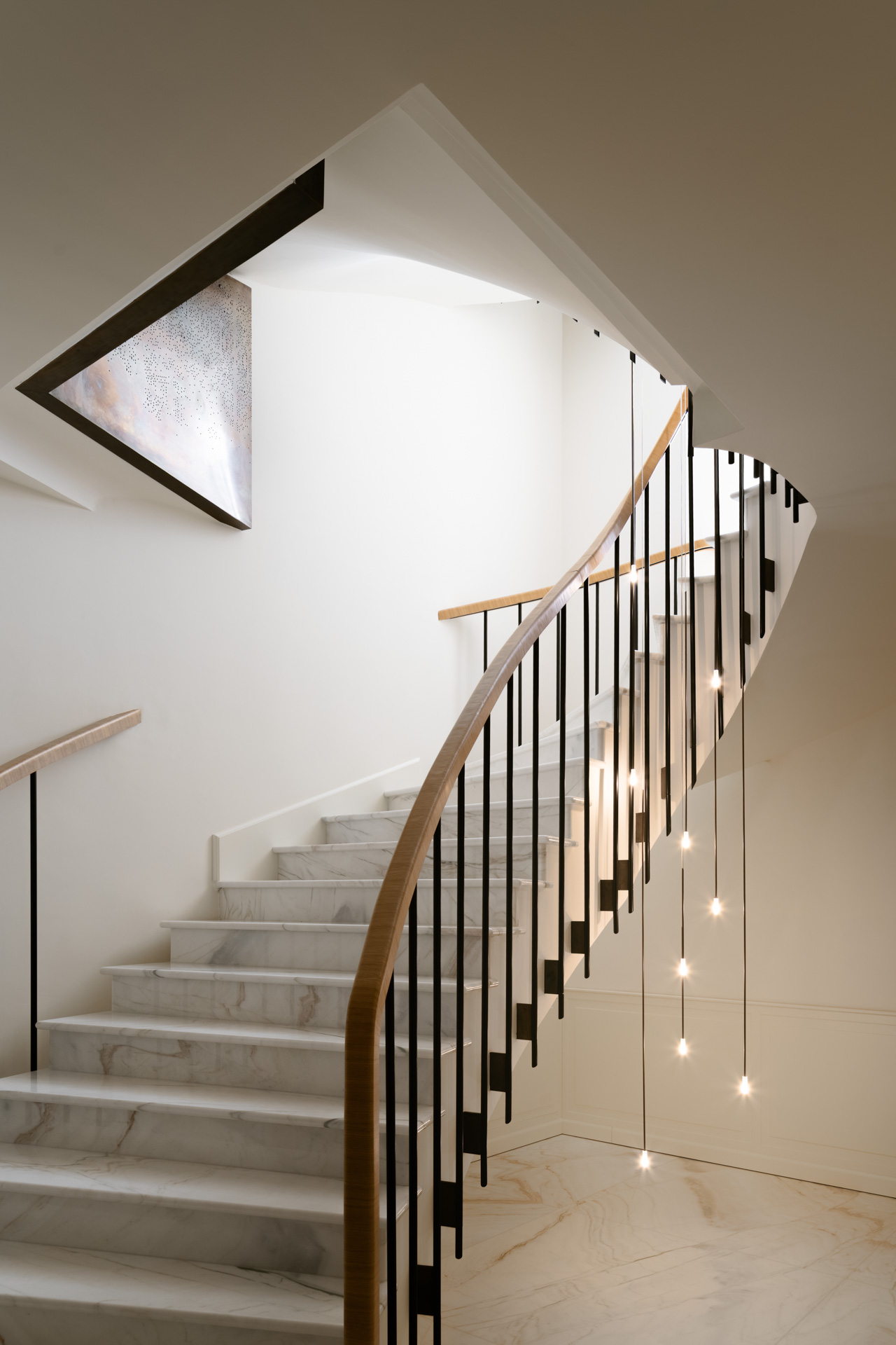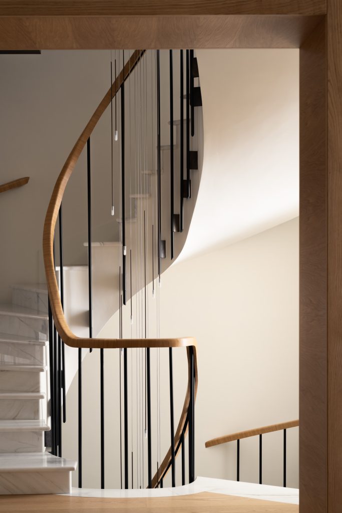 A dominare lo spazio è la scala elicoidale in marmo bianco, avvolta da un nastro continuo di legno: una scultura abitabile che accompagna il movimento verticale e genera prospettive sempre diverse.