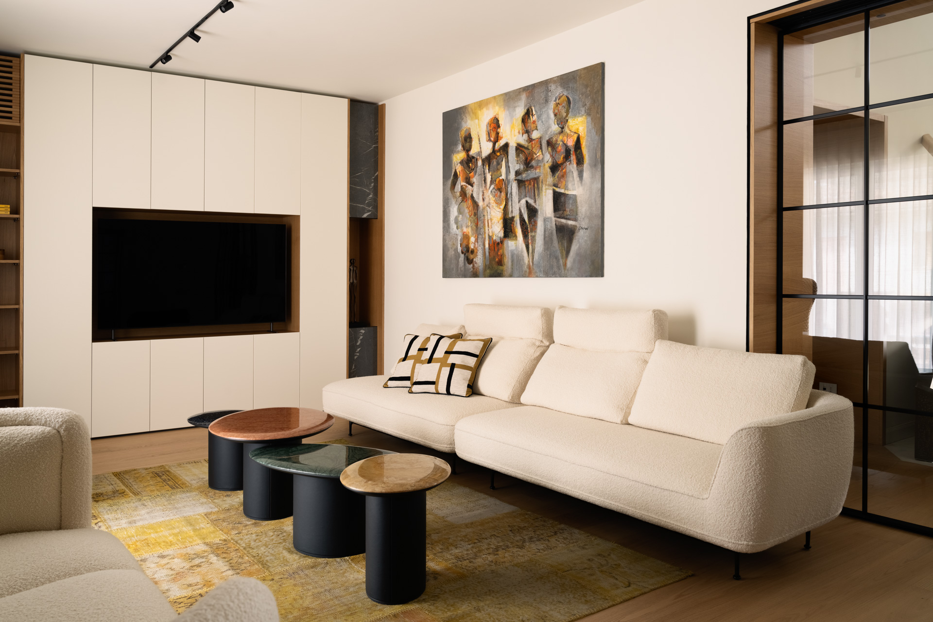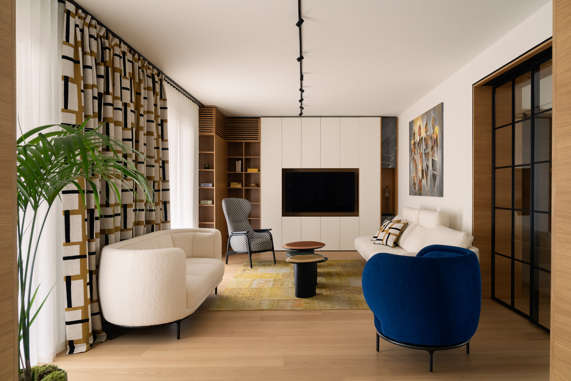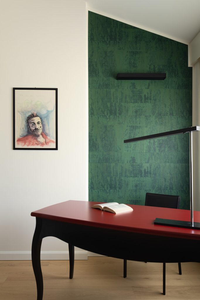 La composizione stilistica si fonda su un equilibrio eclettico e coerente: le parti basse delle pareti, dal carattere più romantico e decorativo, dialogano con le superfici pure e lineari degli ambienti funzionali, generando un linguaggio raffinato e contemporaneo.