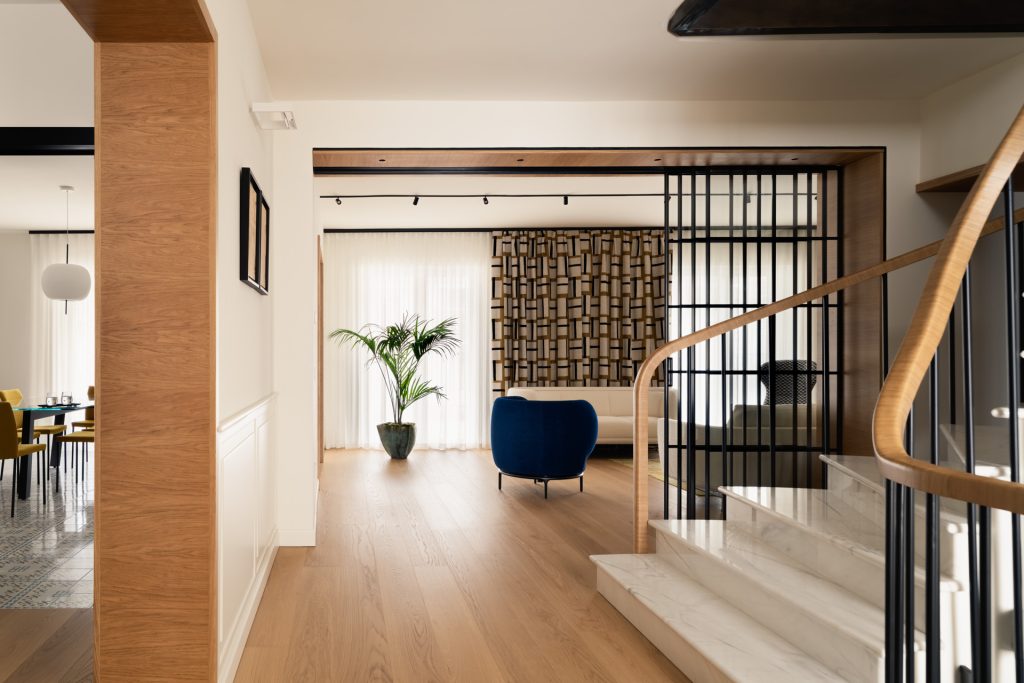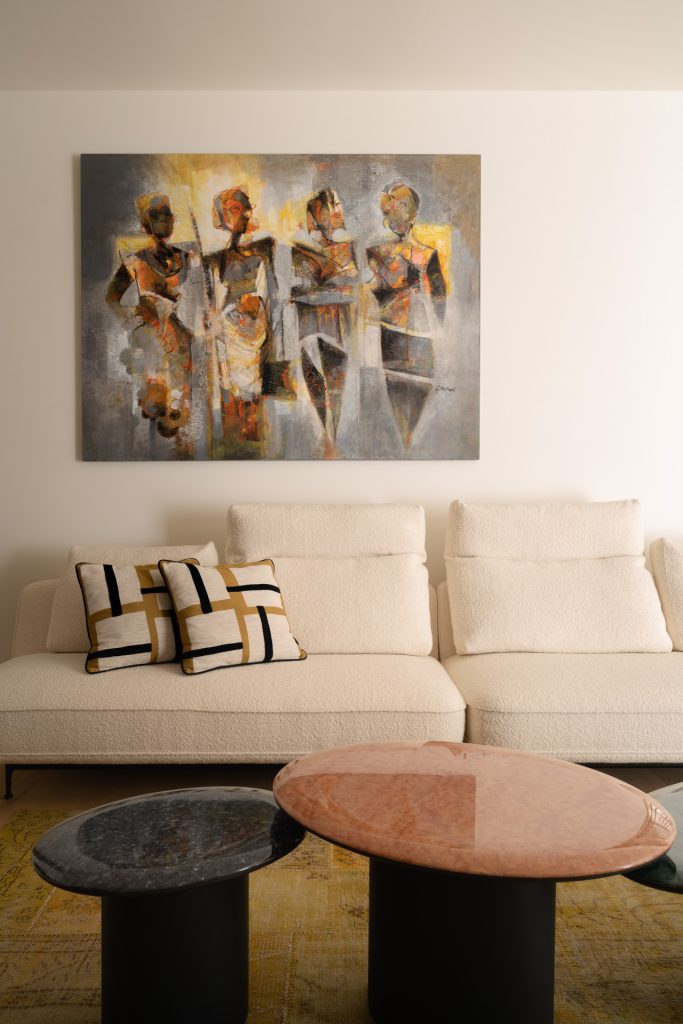 La scala, oltre a collegare i piani, ospita una galleria verticale di opere d’arte, concepita come parte integrante dell’esperienza abitativa.