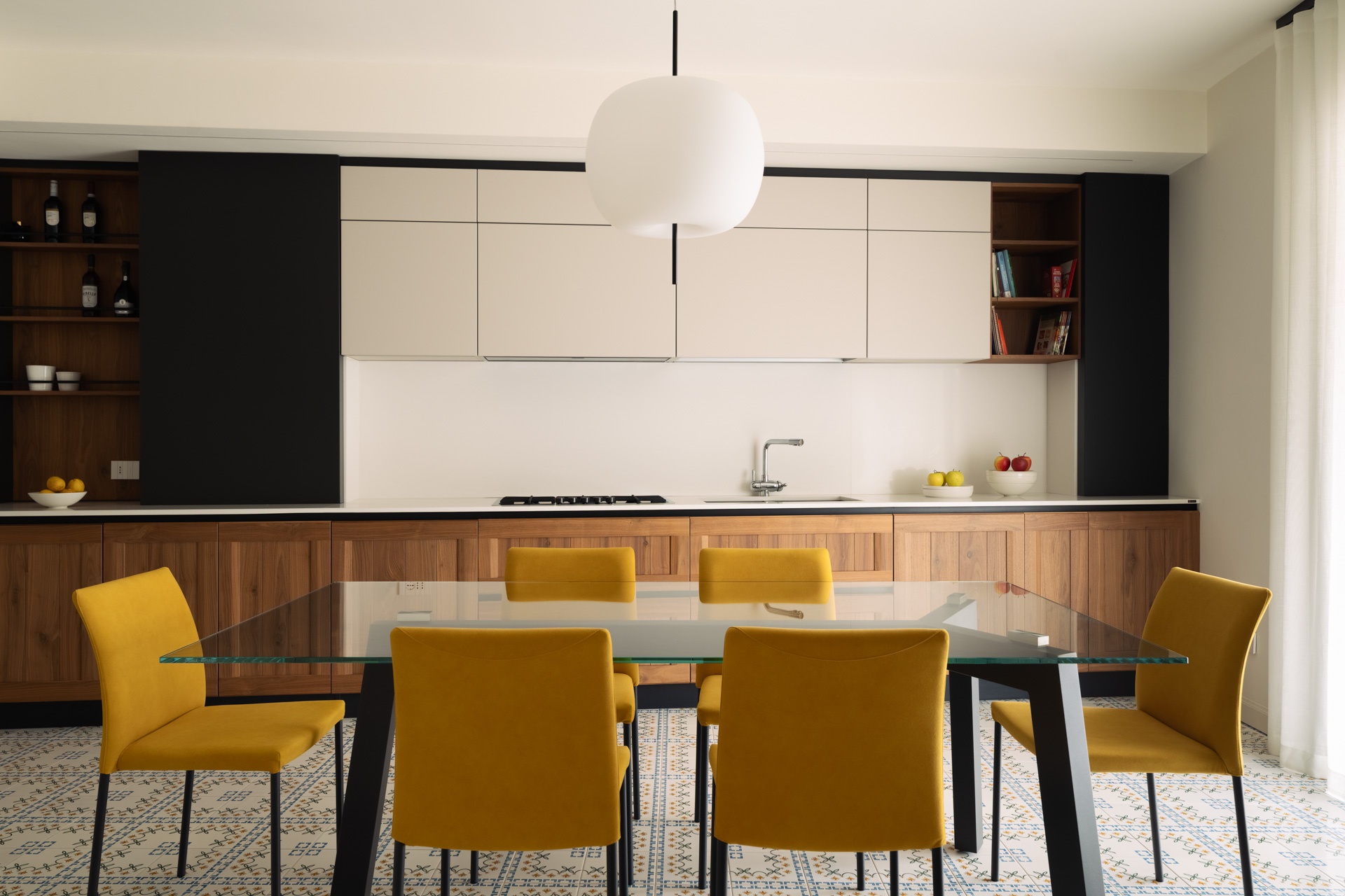 Progettata come spazio aperto e dinamico, si affaccia da un lato sulla sala da pranzo, dominata da un grande tavolo di condivisione, e dall’altro sulla zona living, disegnata da una composizione di sofà pensata come esaltazione del conversare e del vivere insieme.