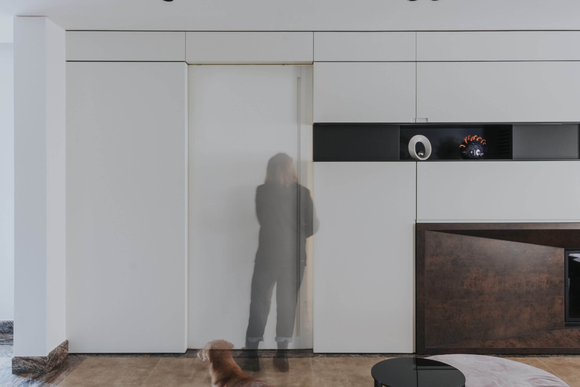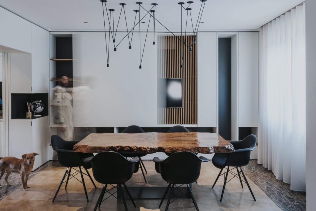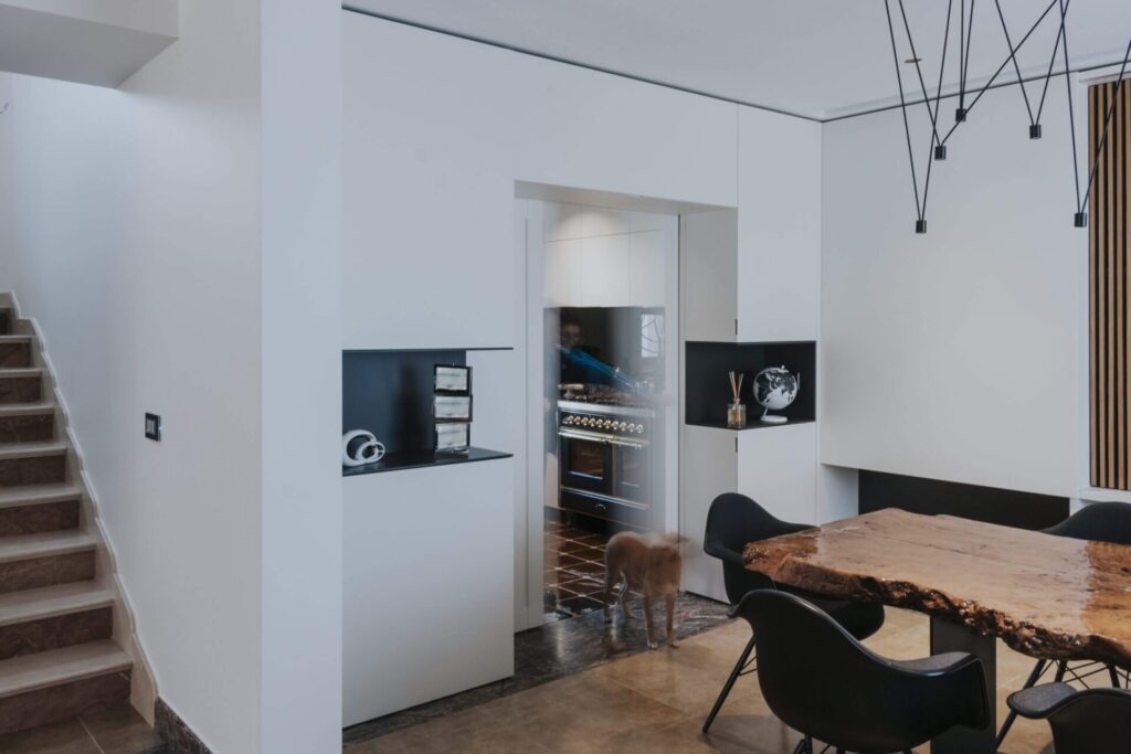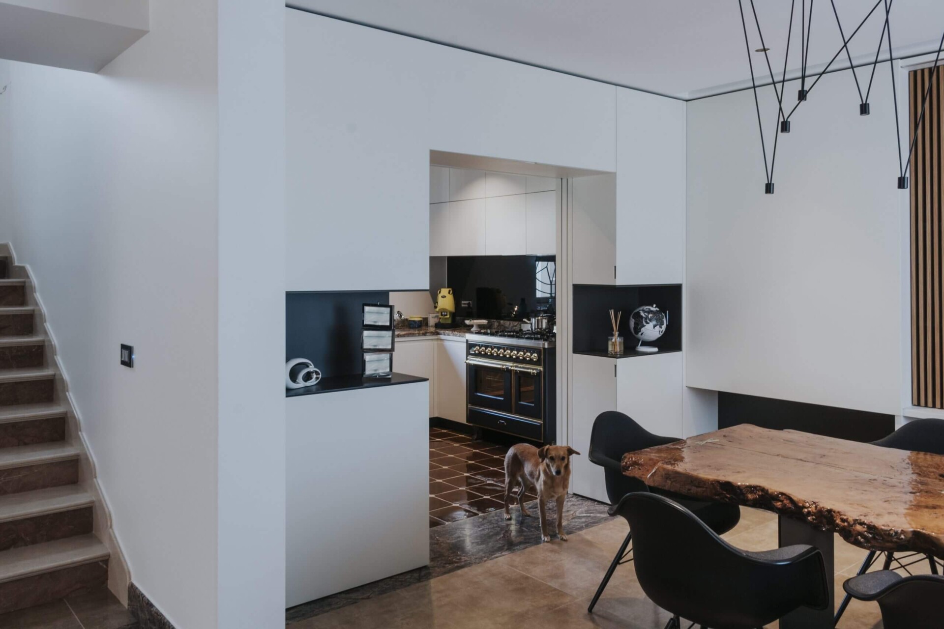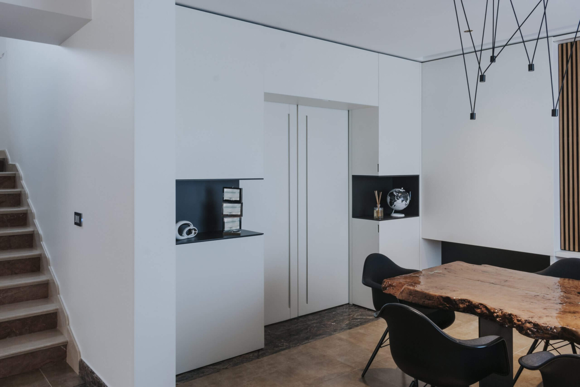Questo, un progetto dalla volontà chiara, “mostrarsi solo al momento giusto”. Un unico Velo Bianco in falegnameria che avvolge l’interno progetto, svelando a suo piacimento i diversi volti che lo compongono. Prima ingresso, poi spazio del fuoco e chiude, abbracciando la tavola, cardine della famiglia, quest’ultima recuperando il tavolato in ulivo intorno al quale si era bambini per poi diventare adulti.