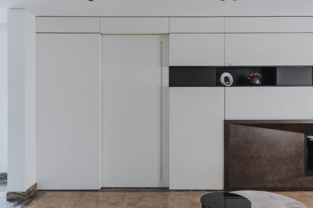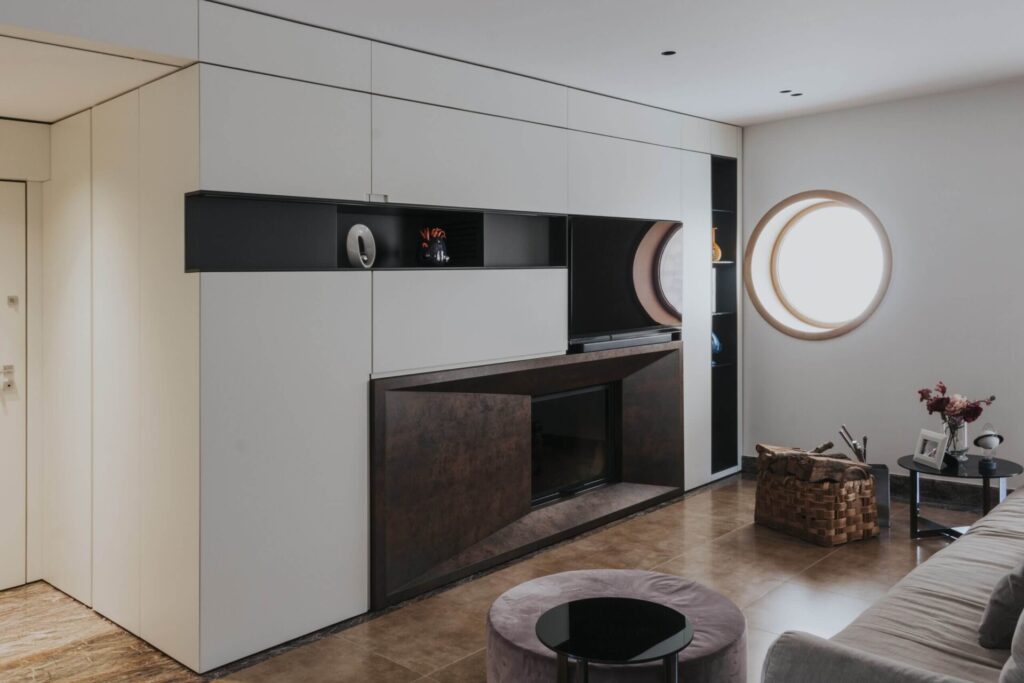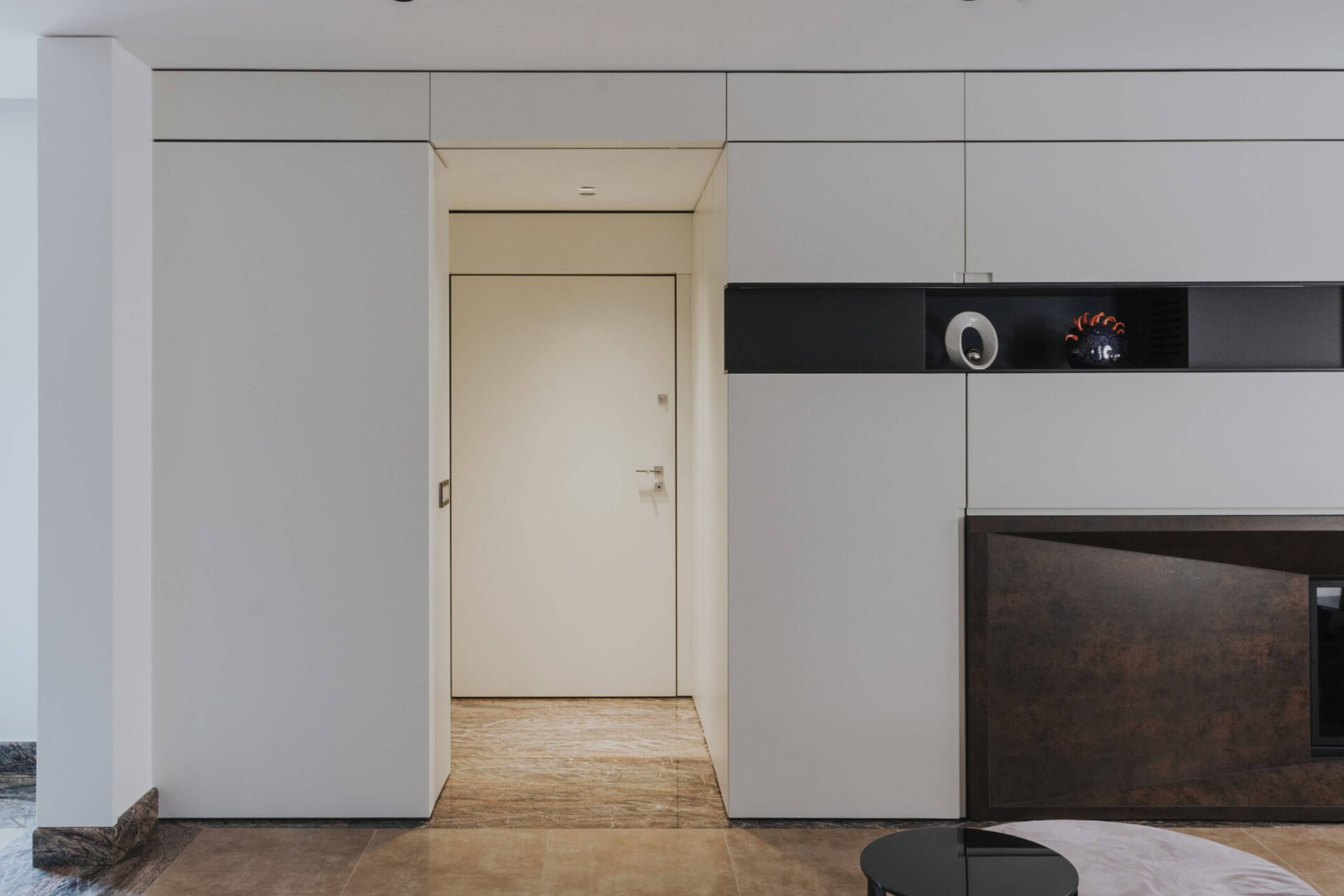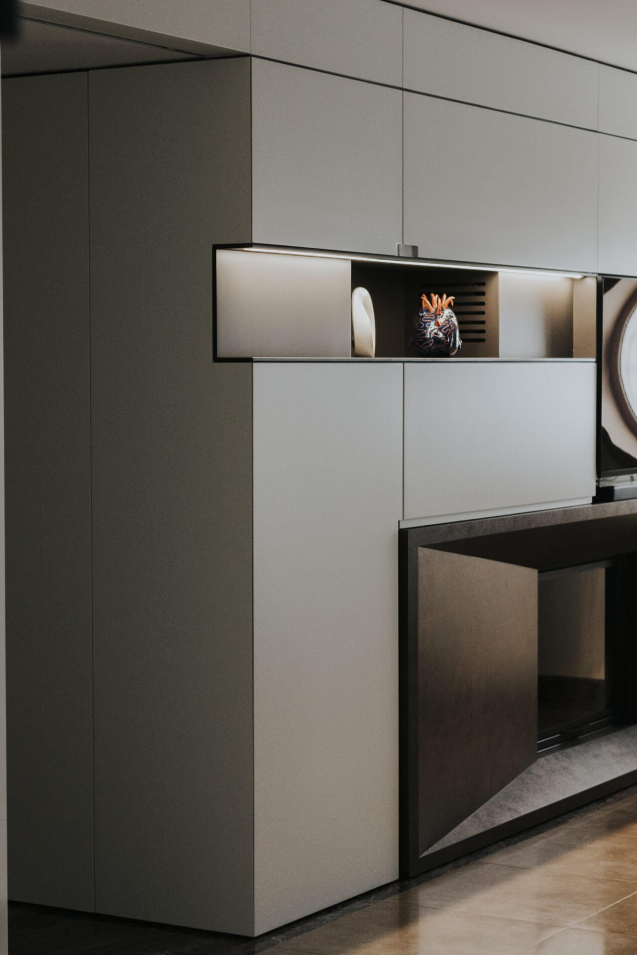 Questo, un progetto dalla volontà chiara, “mostrarsi solo al momento giusto”. Un unico Velo Bianco in falegnameria che avvolge l’interno progetto, svelando a suo piacimento i diversi volti che lo compongono. Prima ingresso, poi spazio del fuoco e chiude, abbracciando la tavola, cardine della famiglia, quest’ultima recuperando il tavolato in ulivo intorno al quale si era bambini per poi diventare adulti.