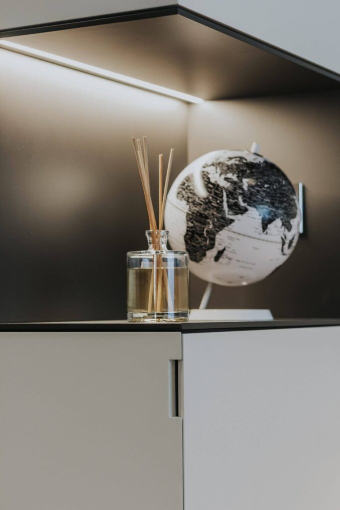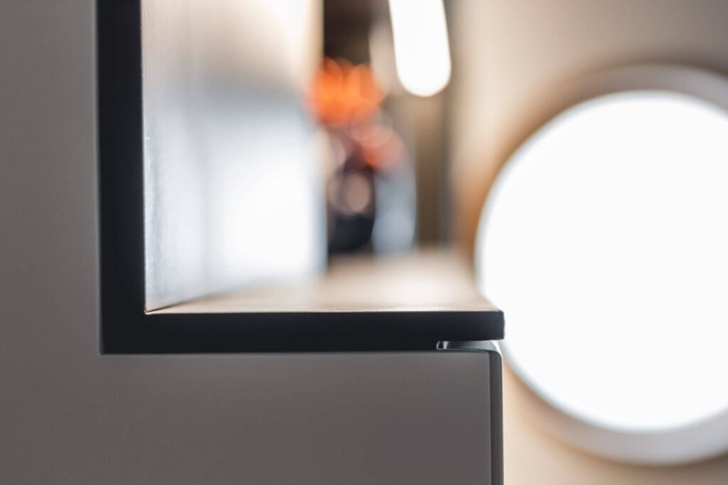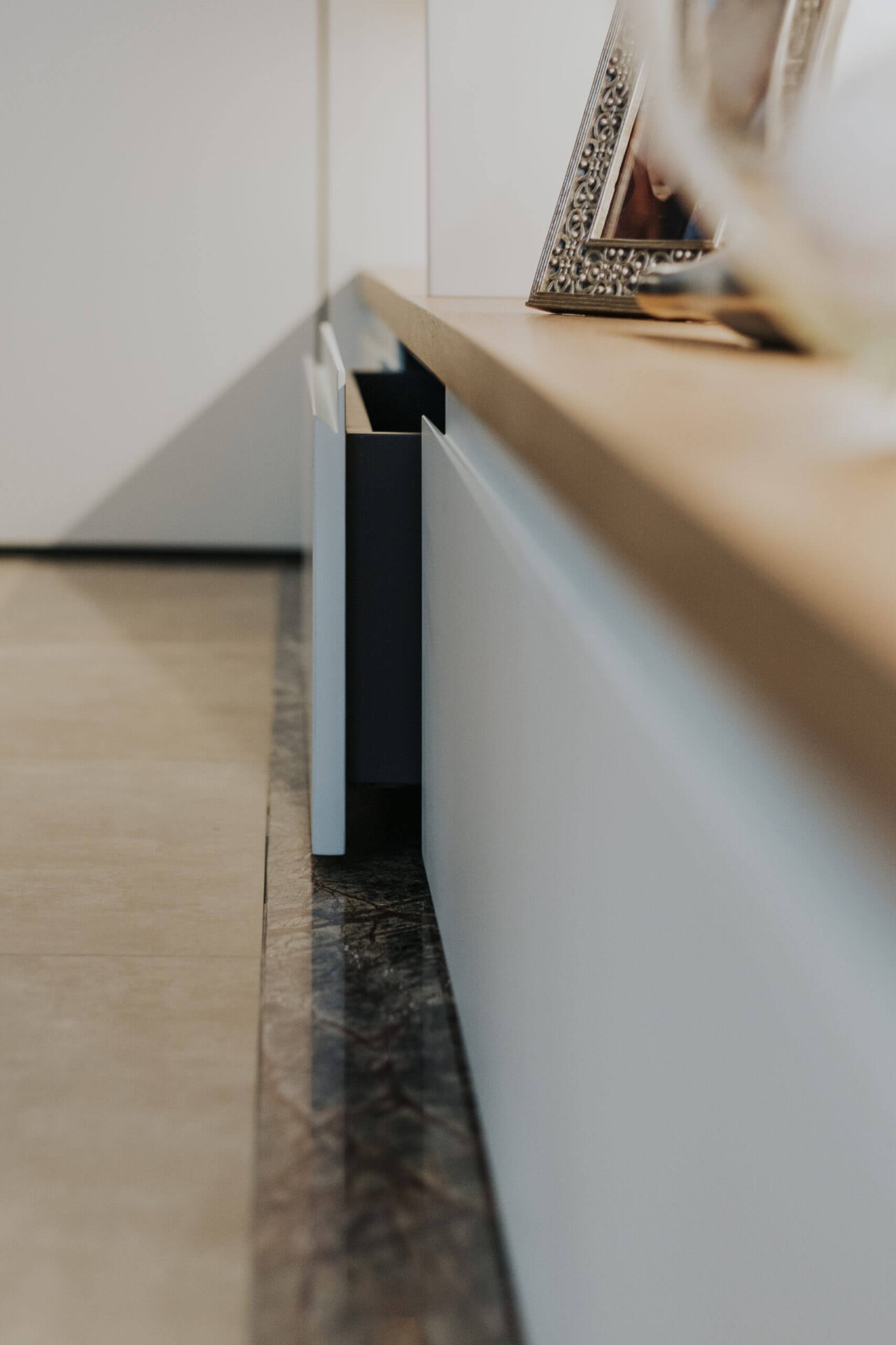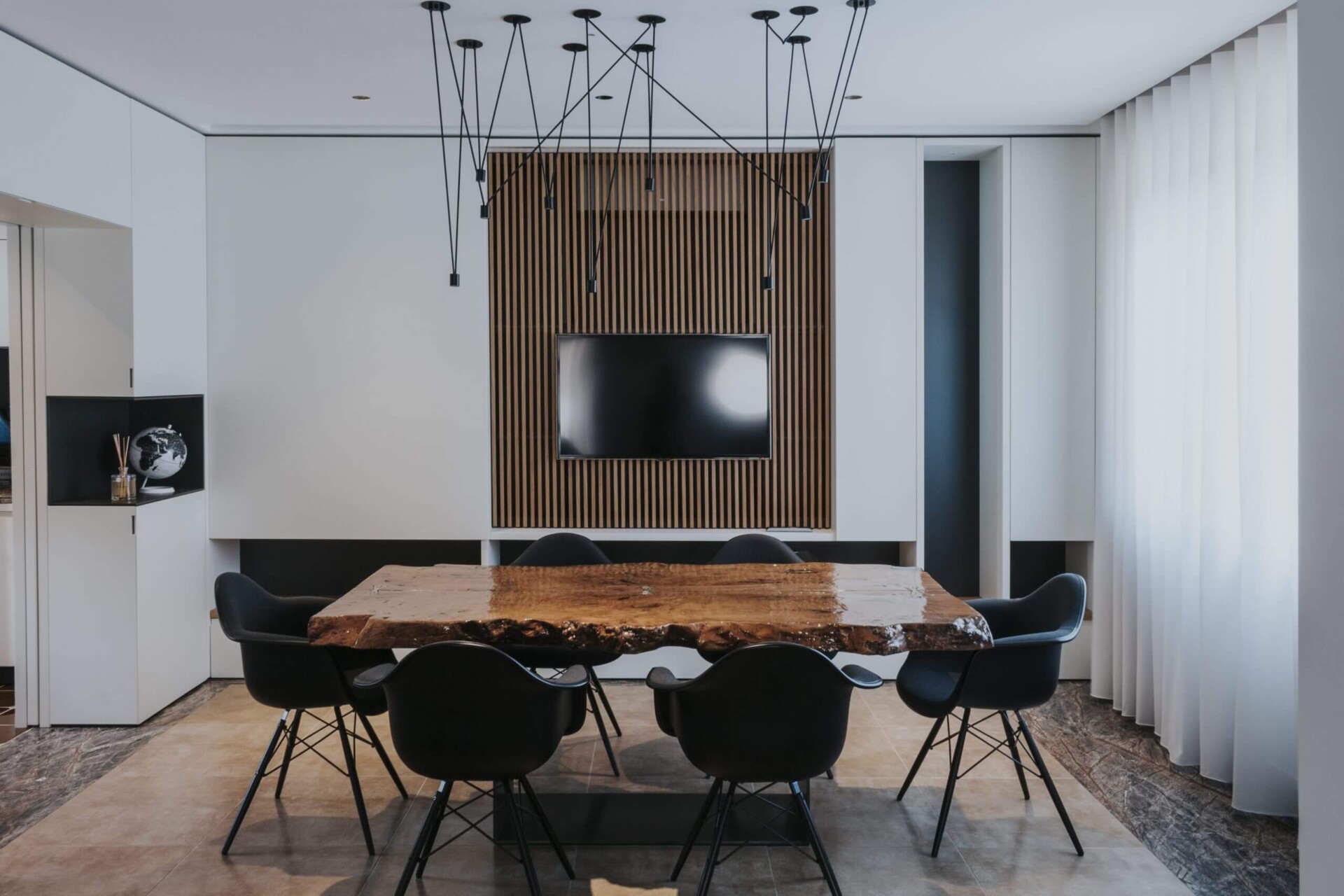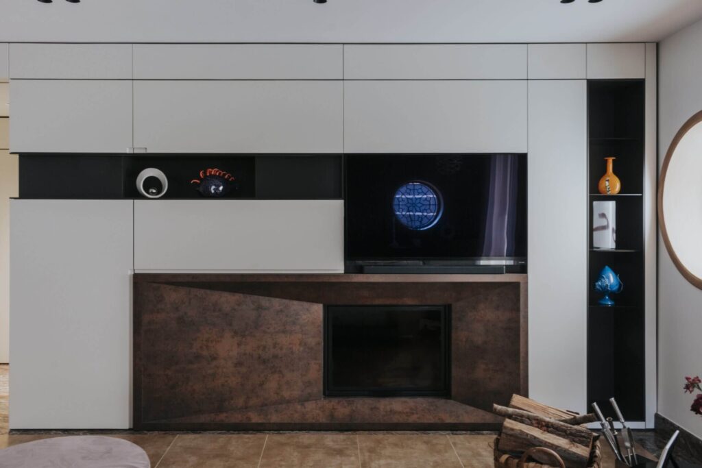 Questo, un progetto dalla volontà chiara, “mostrarsi solo al momento giusto”. Un unico Velo Bianco in falegnameria che avvolge l’interno progetto, svelando a suo piacimento i diversi volti che lo compongono. Prima ingresso, poi spazio del fuoco e chiude, abbracciando la tavola, cardine della famiglia, quest’ultima recuperando il tavolato in ulivo intorno al quale si era bambini per poi diventare adulti.