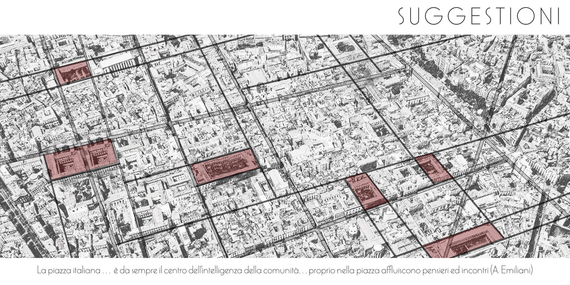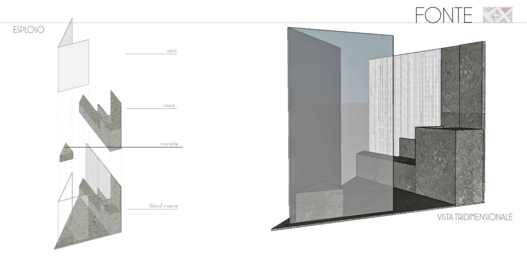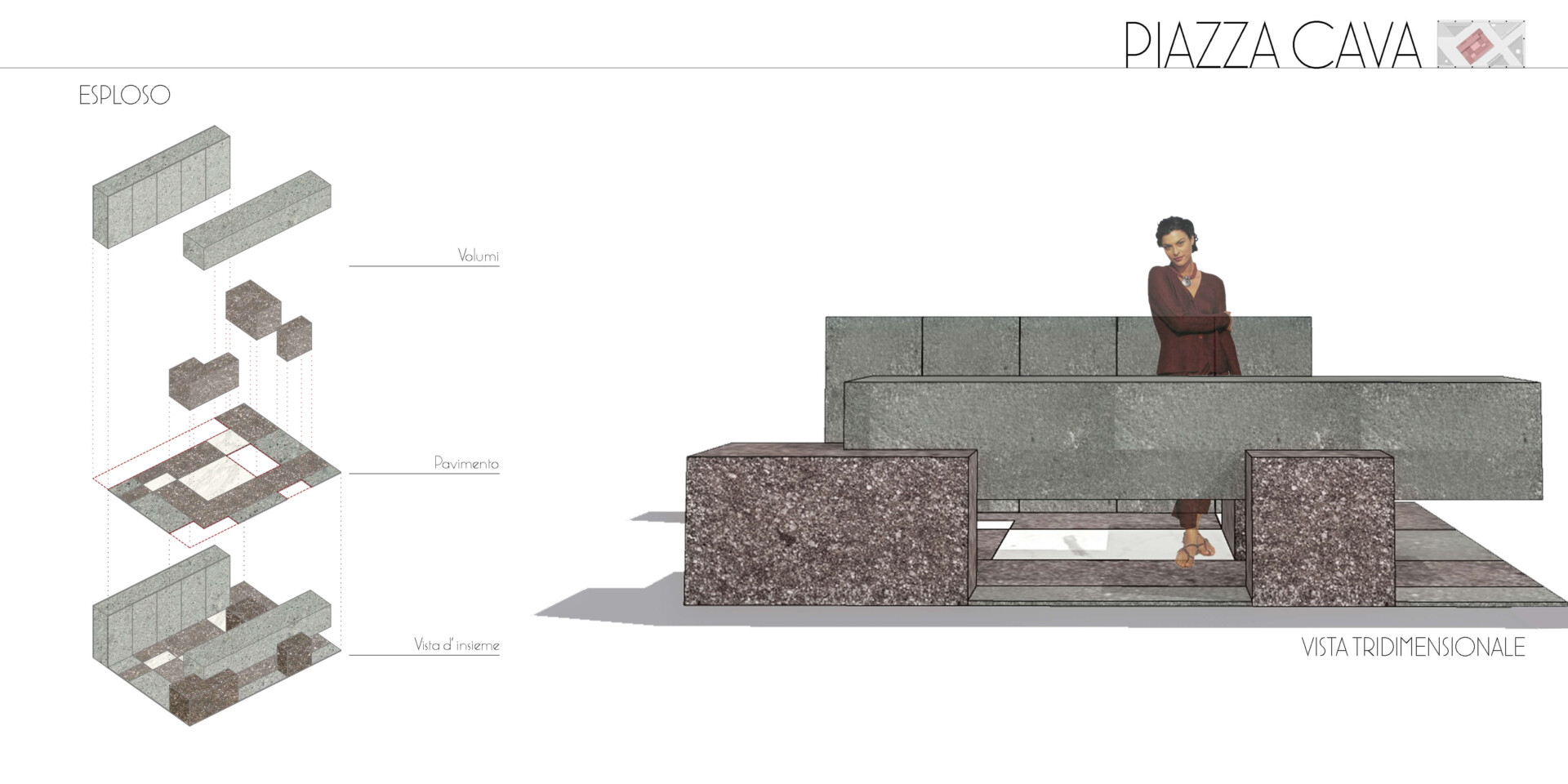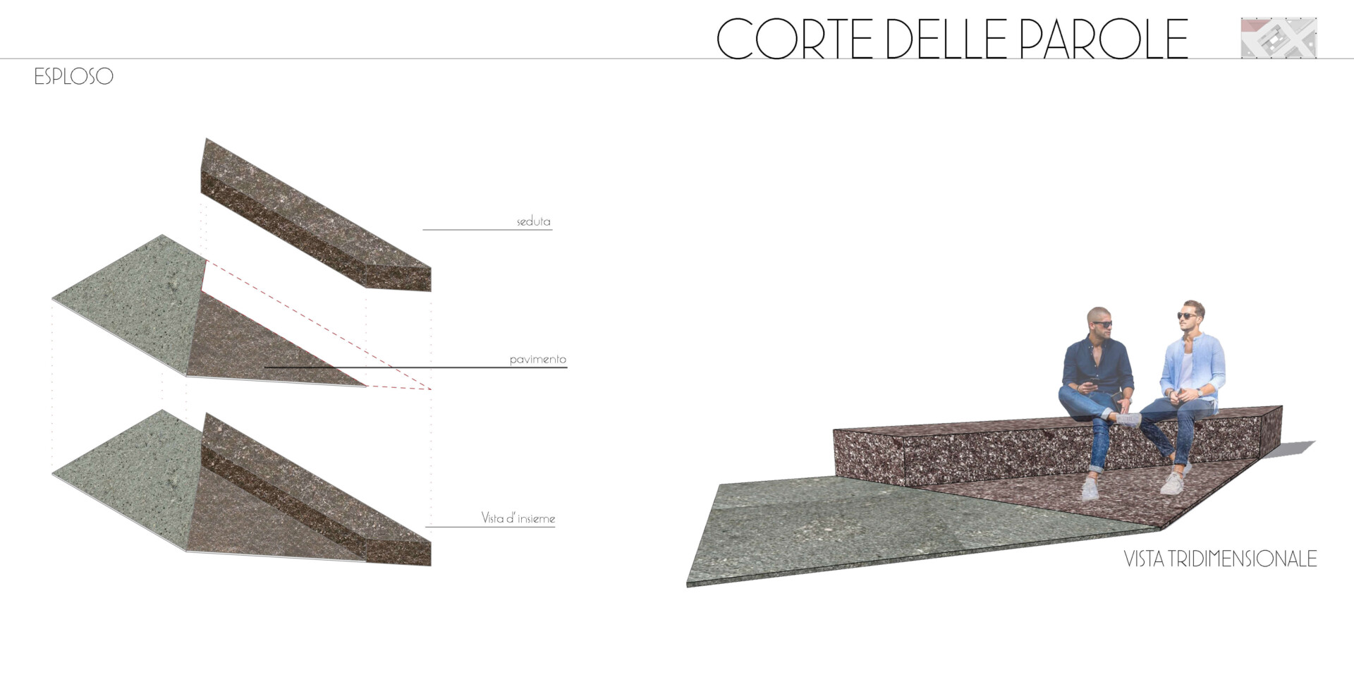 Il cuore dell’allestimento è la piazza centrale realizzata con blocchi monolitici ottenuti da un apparente fare stereotomico che si evince dal radicamento tra gli oggetti elevati e le superfici del pavimento. Una suggestione che allude ad un possibile luogo conviviale come una zona giorno tra cucina e spazio a stare.