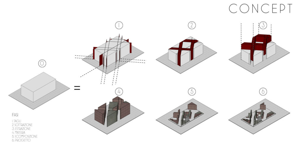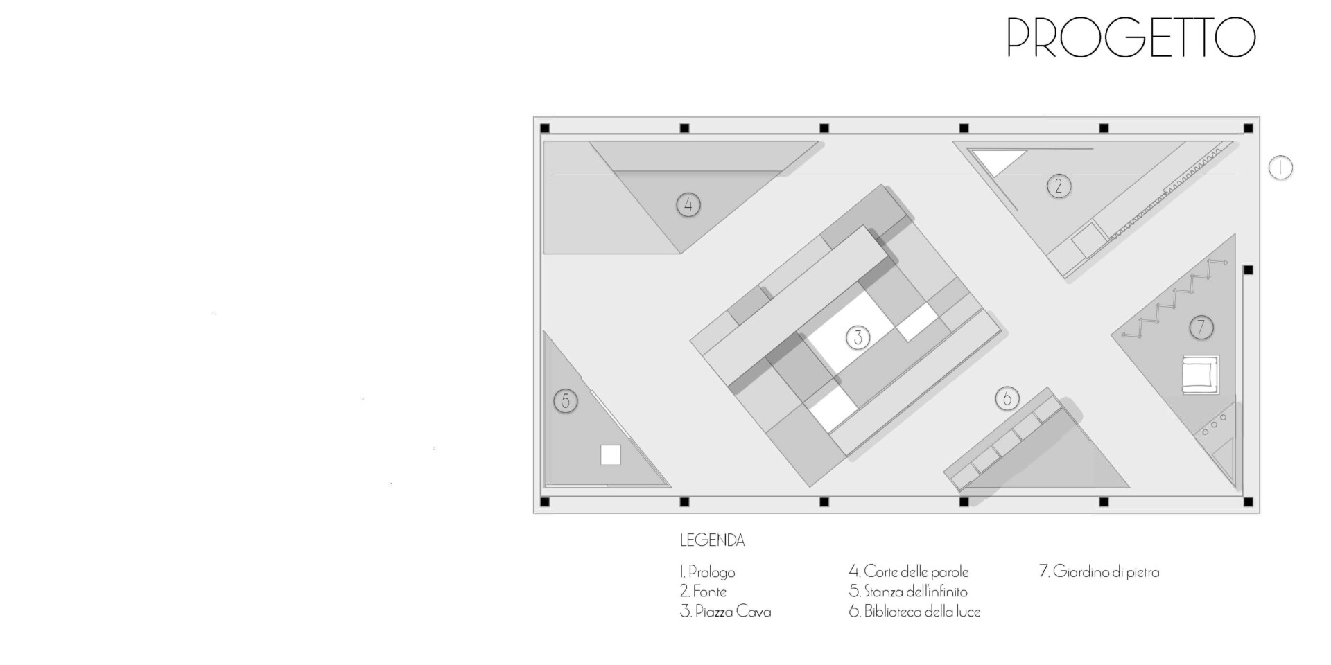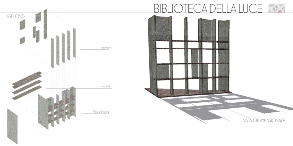 In basso nel baricentro si attraversa uno spazio semi contenitivo che tagliato dalla luce allude ad una biblioteca tra luce e cultura.
