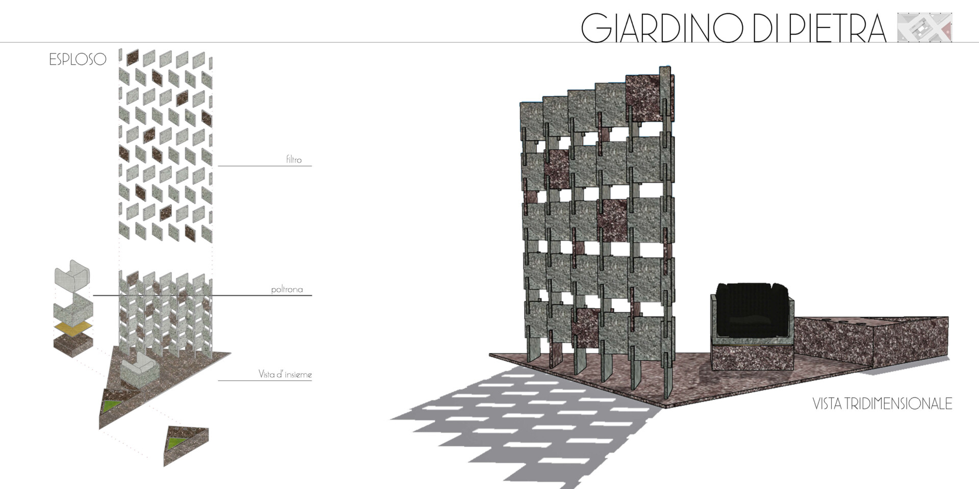 In basso a destra un gioco di incastri di elementi semplici genera la suddivisione di momenti diversi del luogo, rimandando ad un possibile filtro tra uno spazio interno ed esterno.