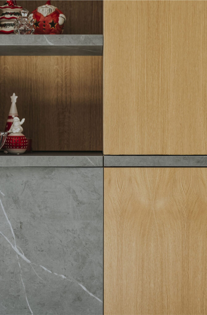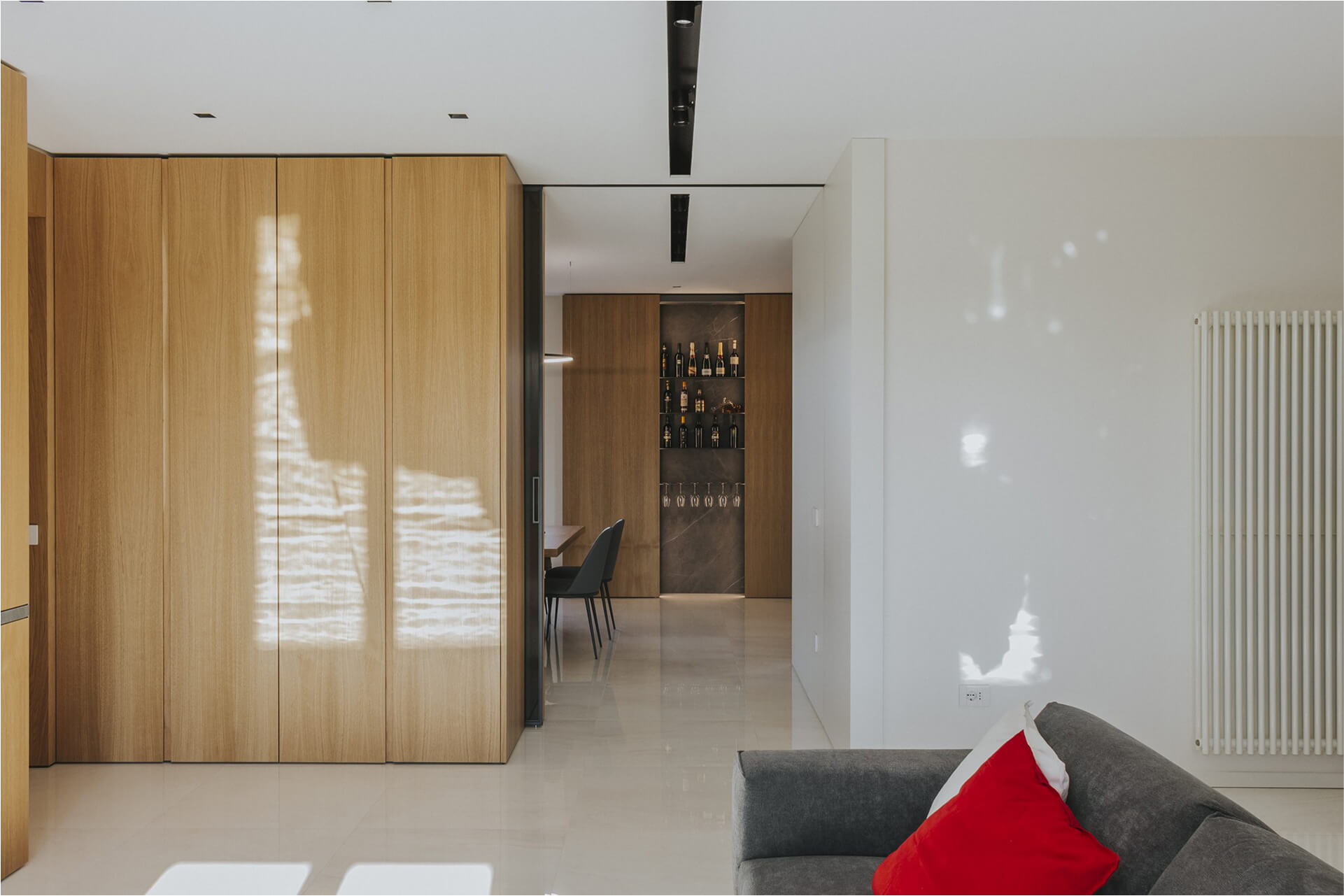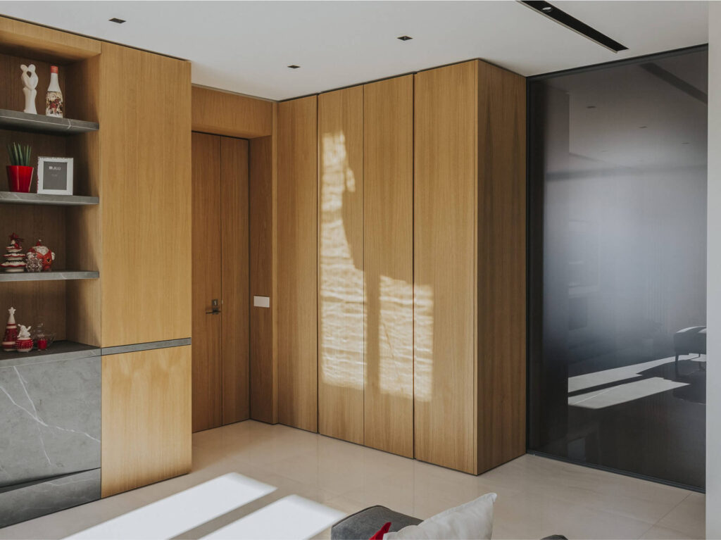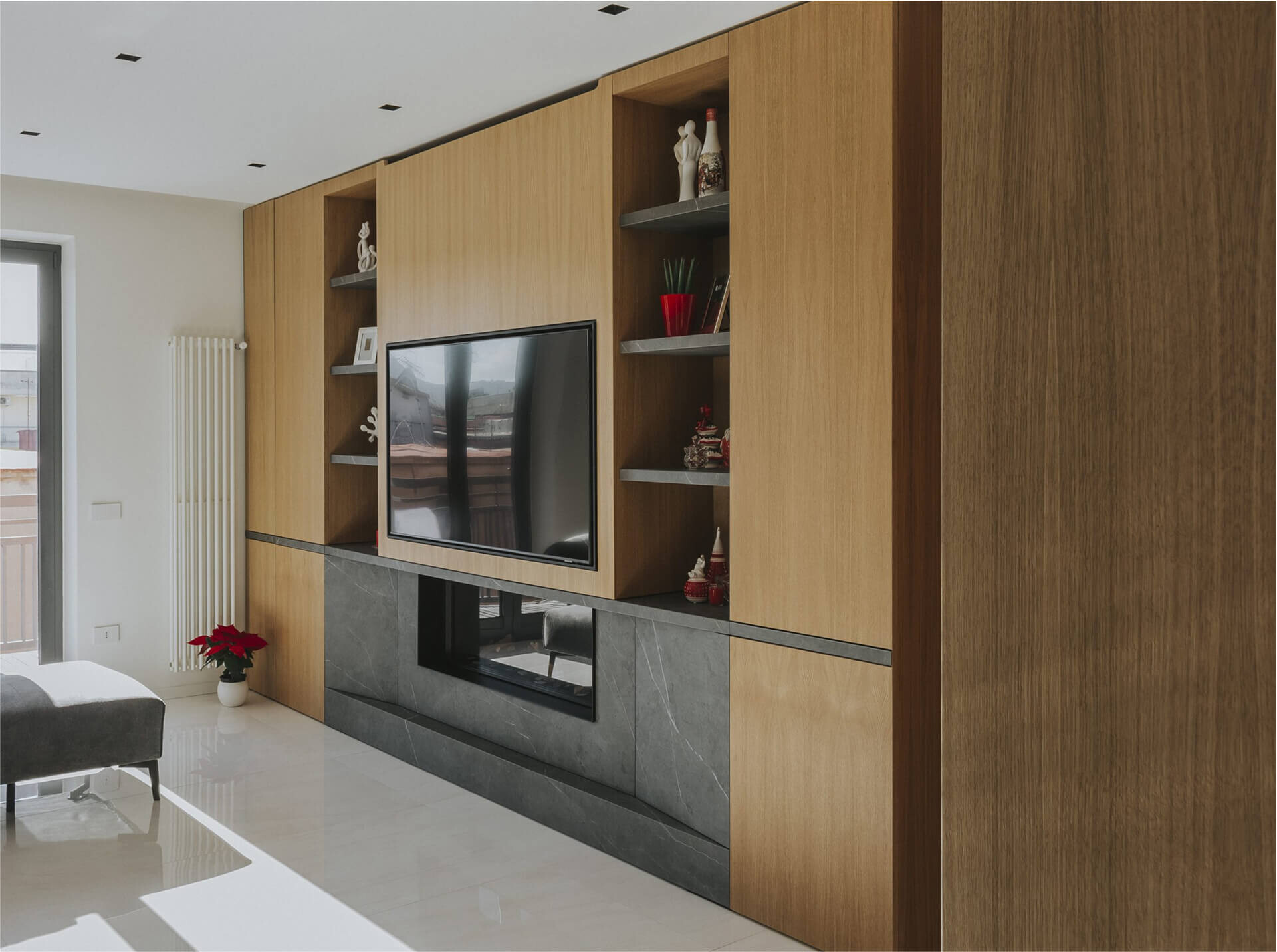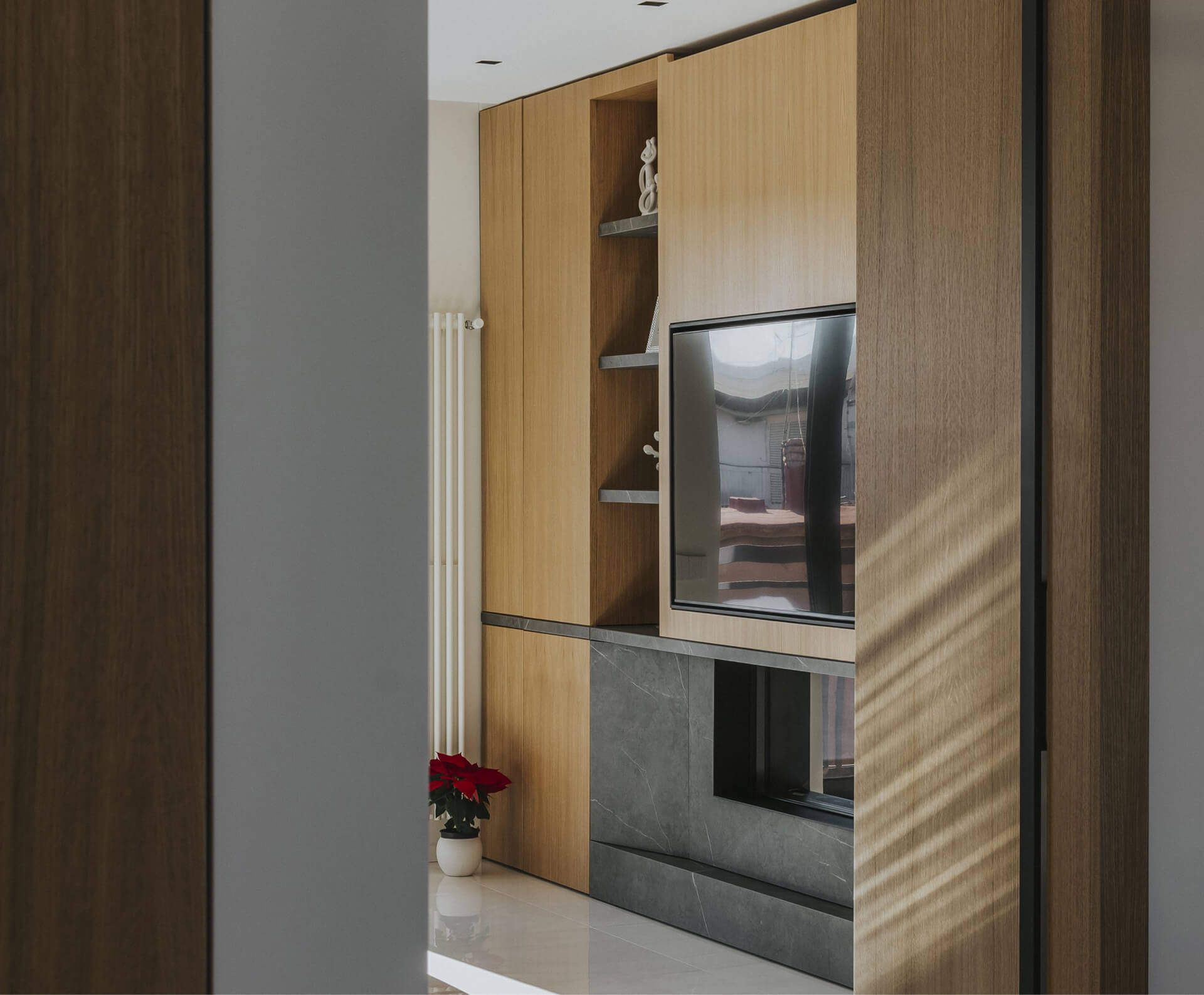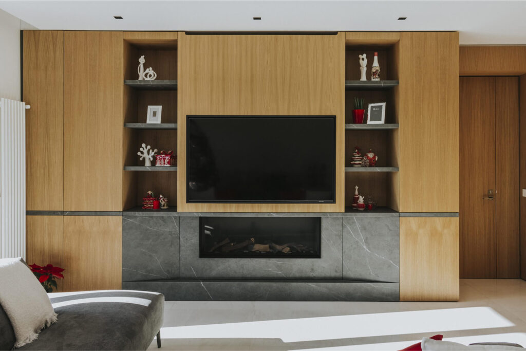 L’ingresso è caratterizzato da un volume a tutta altezza di legno in rovere naturale, che cela un armadio cappottiera, contrapposto da un vano a giorno ottenuto da uno scavo nel volume della parete camino e marcato da ripiani in marmo pietra grey venato bianco. Il marmo sul fronte del volume segna la presenza del camino baricentrico, immerso in un unico volume ligneo contenitivo.