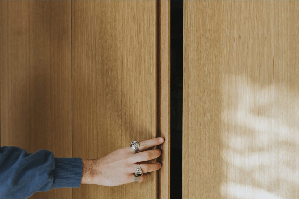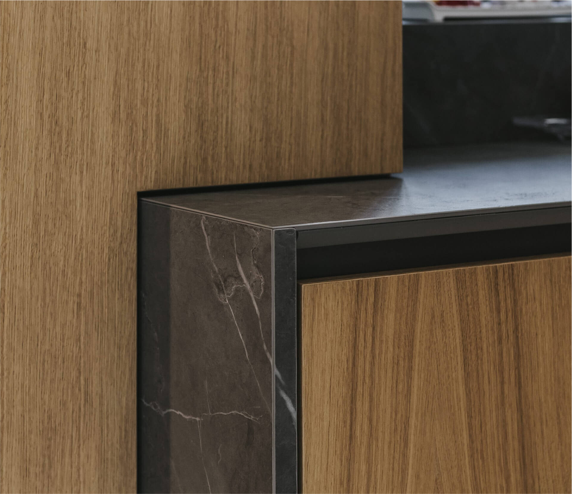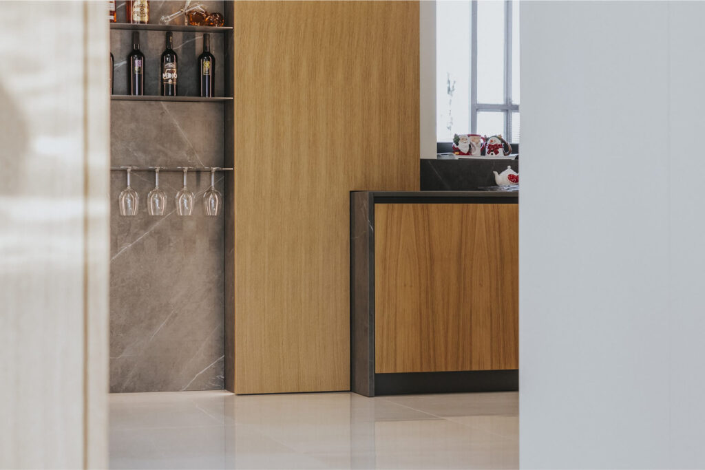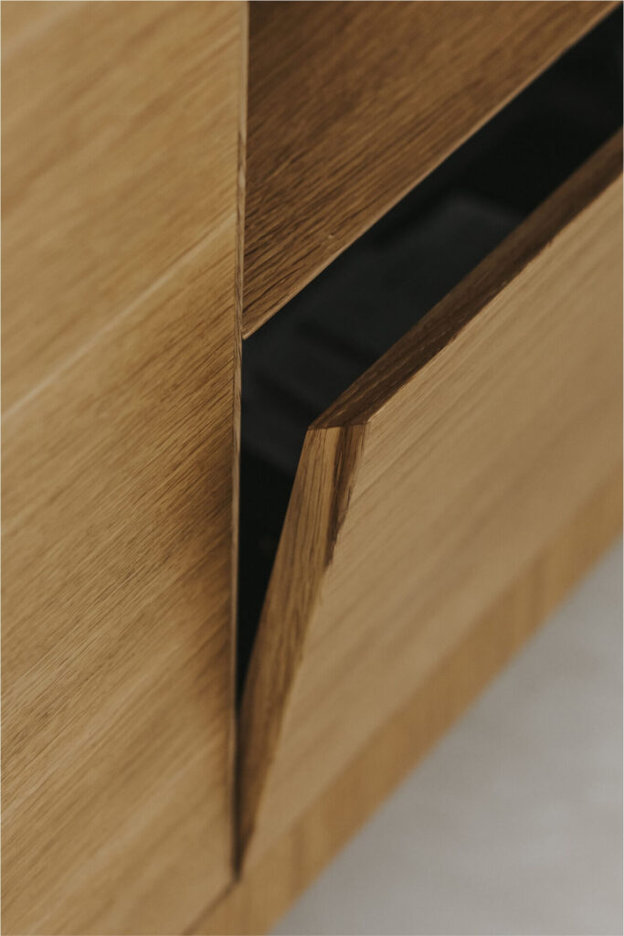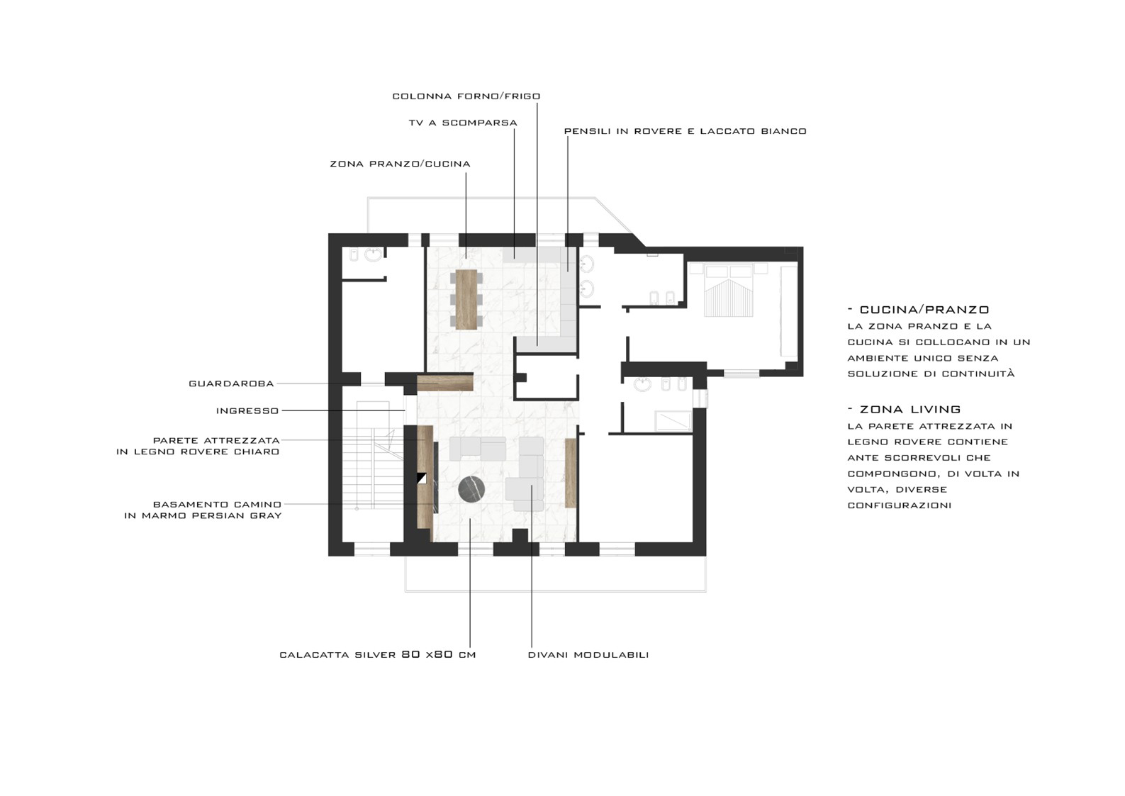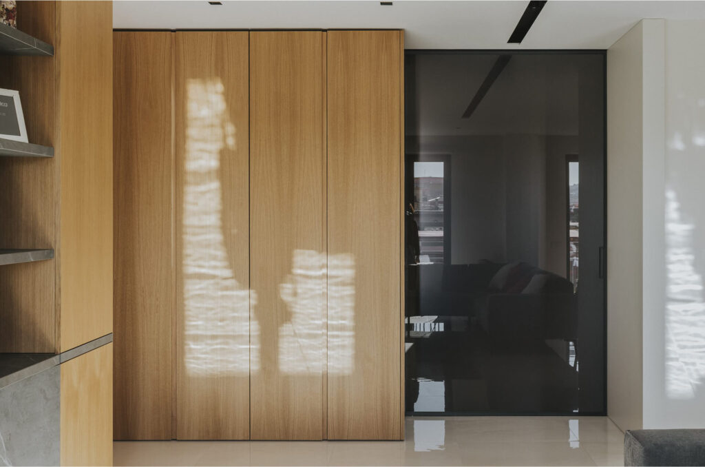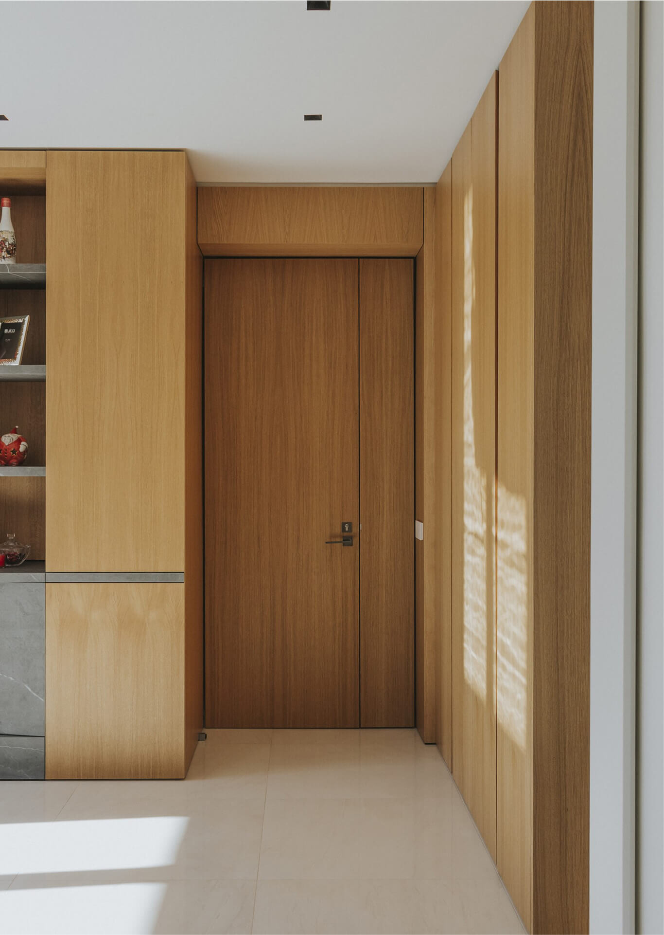 L’ingresso è caratterizzato da un volume a tutta altezza di legno in rovere naturale, che cela un armadio cappottiera, contrapposto da un vano a giorno ottenuto da uno scavo nel volume della parete camino e marcato da ripiani in marmo pietra grey venato bianco. Il marmo sul fronte del volume segna la presenza del camino baricentrico, immerso in un unico volume ligneo contenitivo.