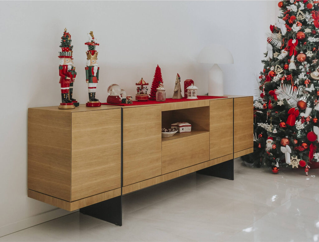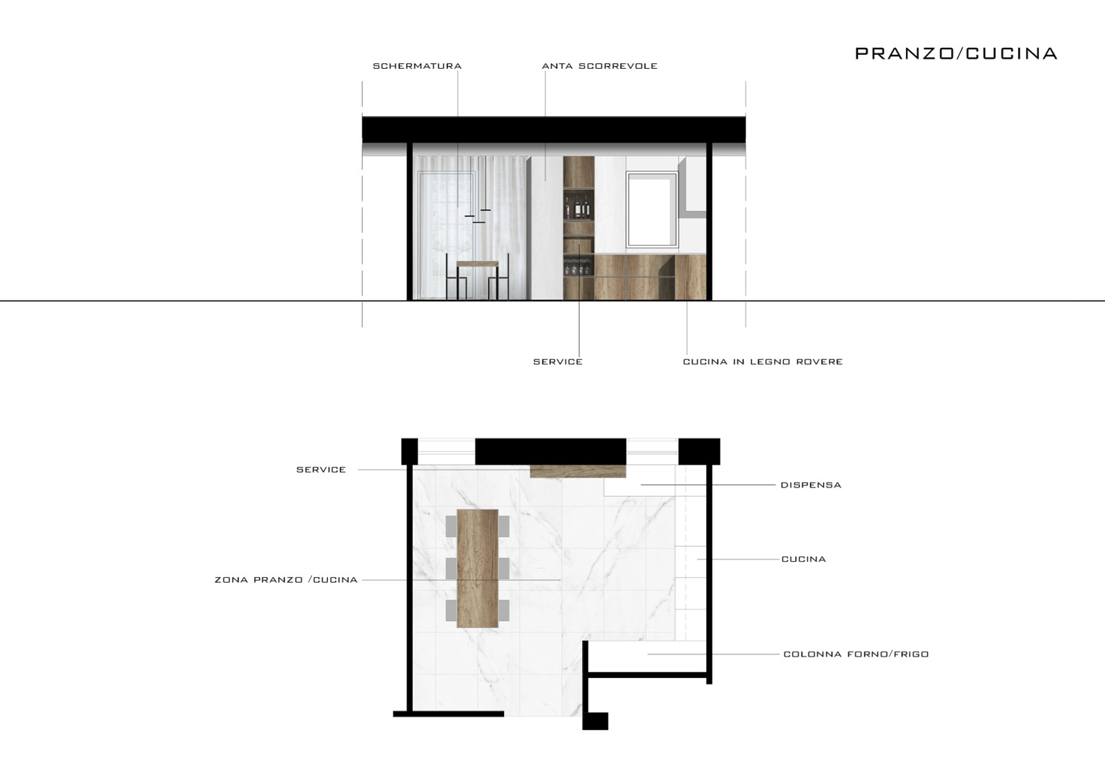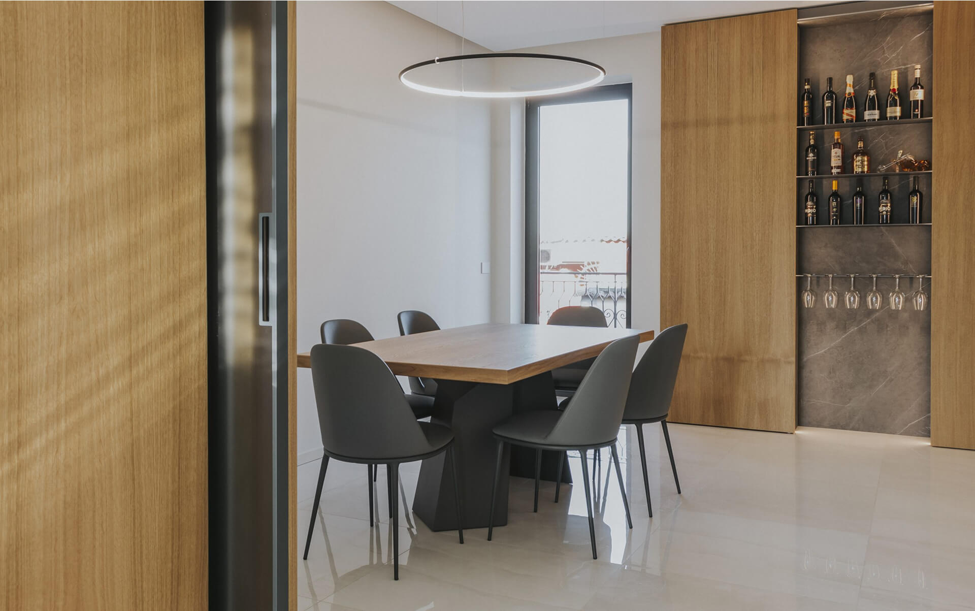 Oltre alla vetrata vi è il tavolo conviviale segnato dalla presenza della sospensione circolare e sul fondo l’armadio dispensa con al centro i moduli vineria e porta calici a servizio del tavolo.