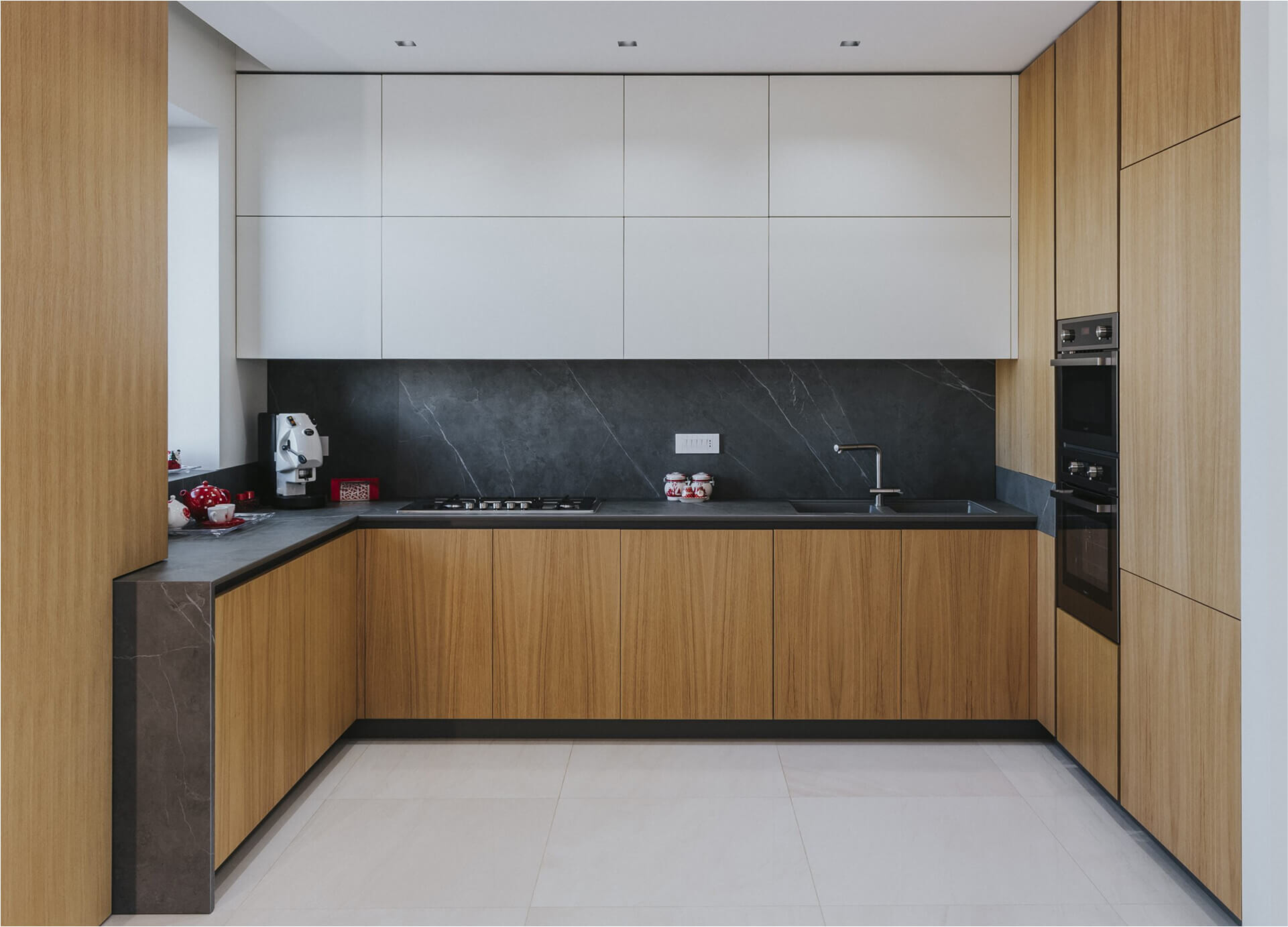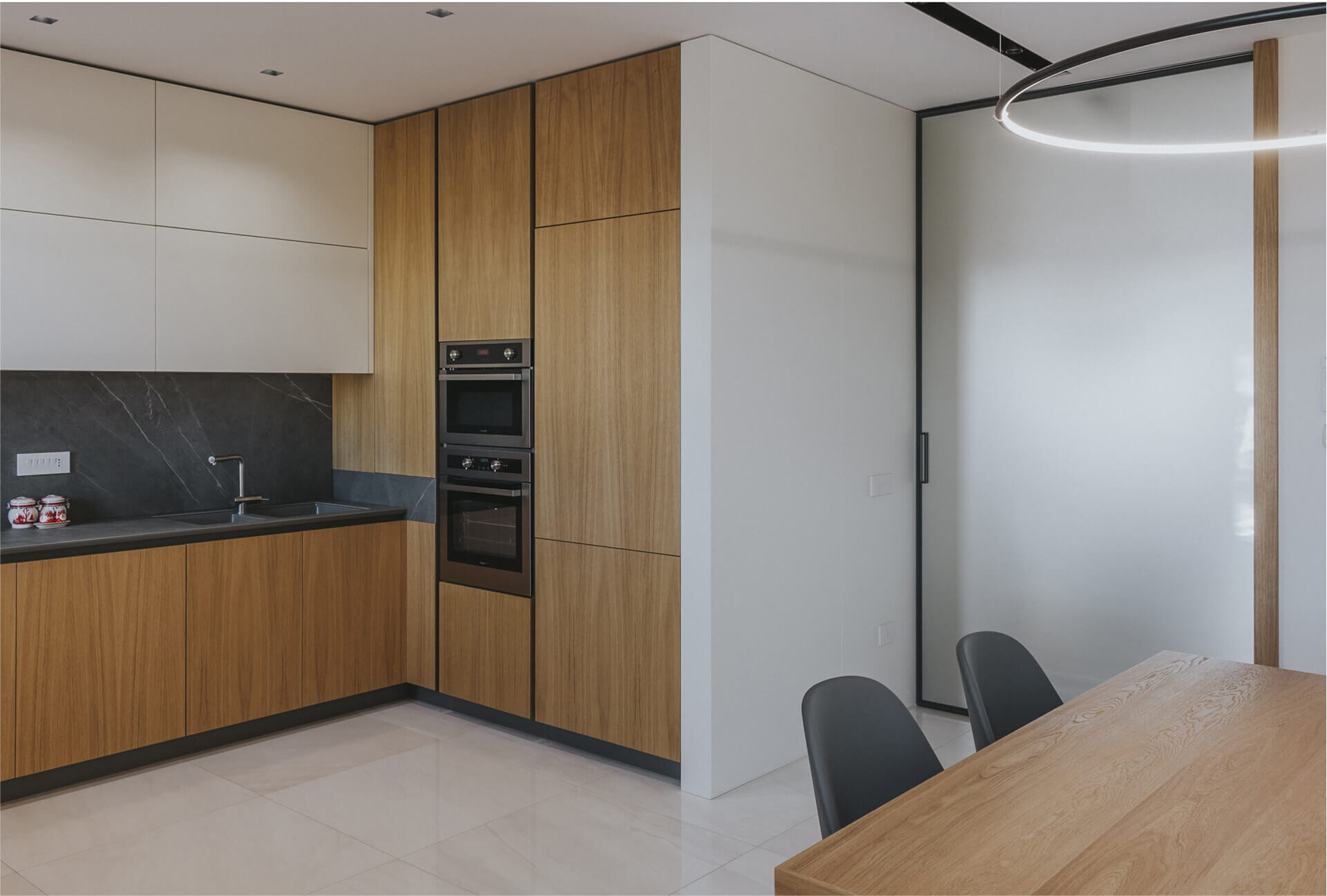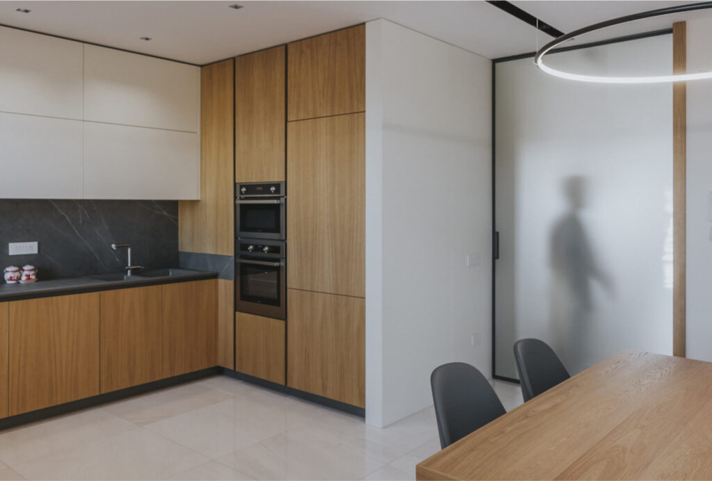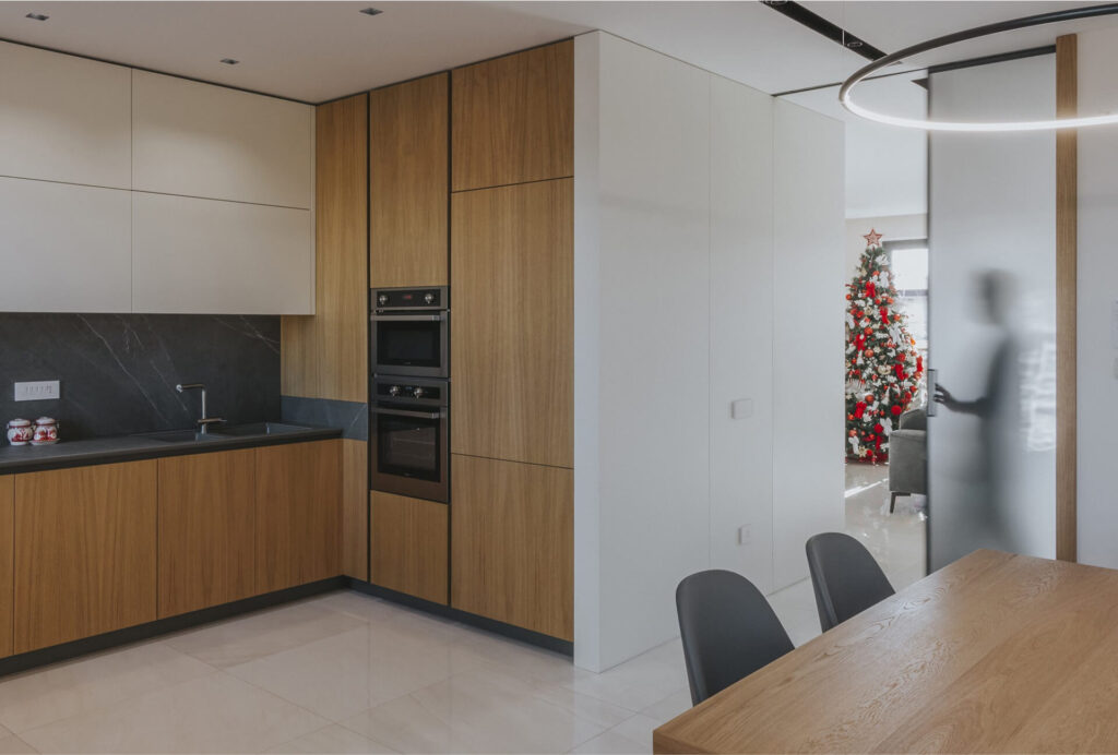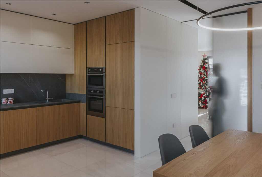 La cucina è retroposta in un sistema di arredi a ferro di cavallo, in cui il lato destro interamente in legno accoglie i dispositivi tecnologici.