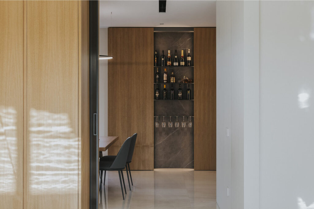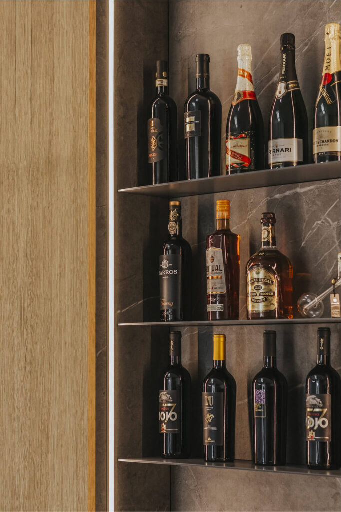 Alle spalle del divano è stato realizzato un mobile bar monolitico in legno a servizio della zona relax.