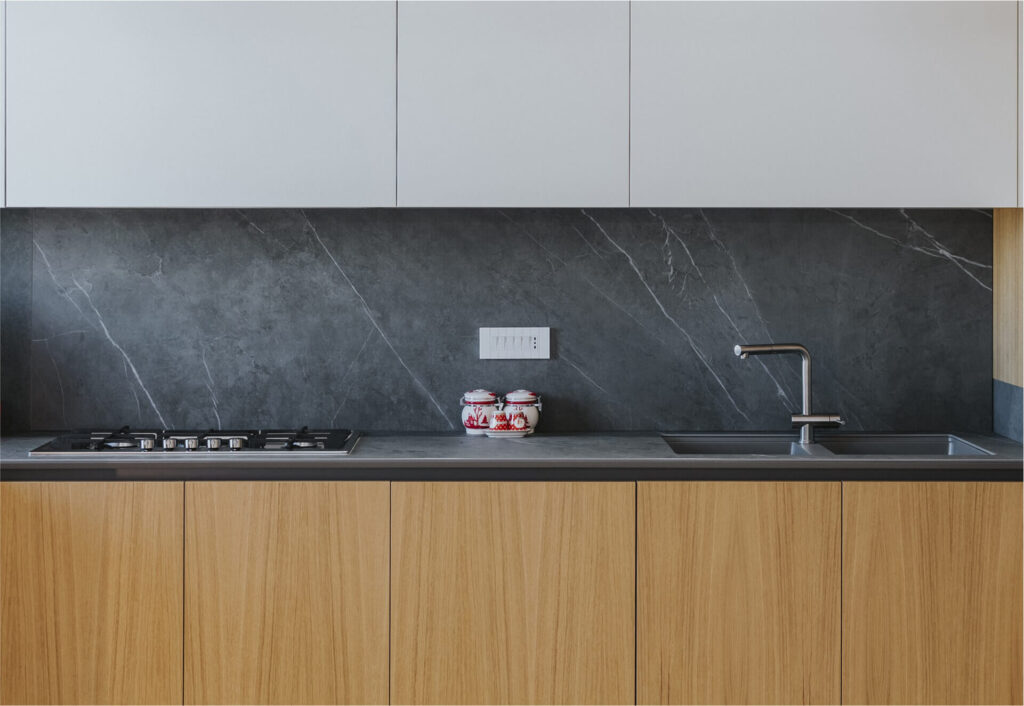 Congiunto a tale composizione è il piano e il rivestimento murale in marmo che delineano un evidente contrasto.